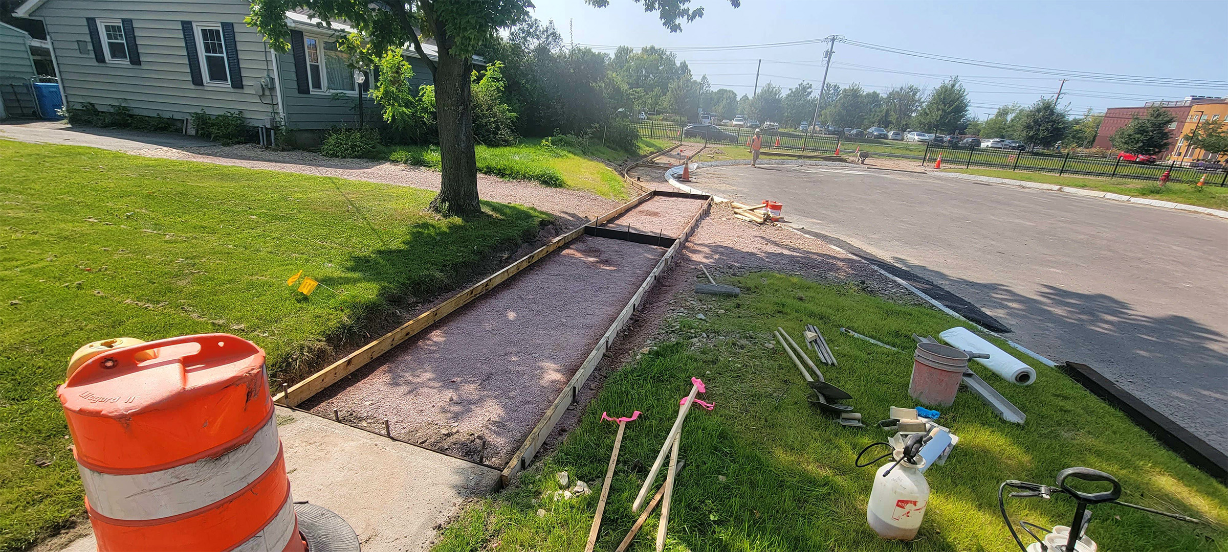 Forming the new concrete sidewalks along the Ferguson Avenue cul-de-sac in preparation for concrete pours.