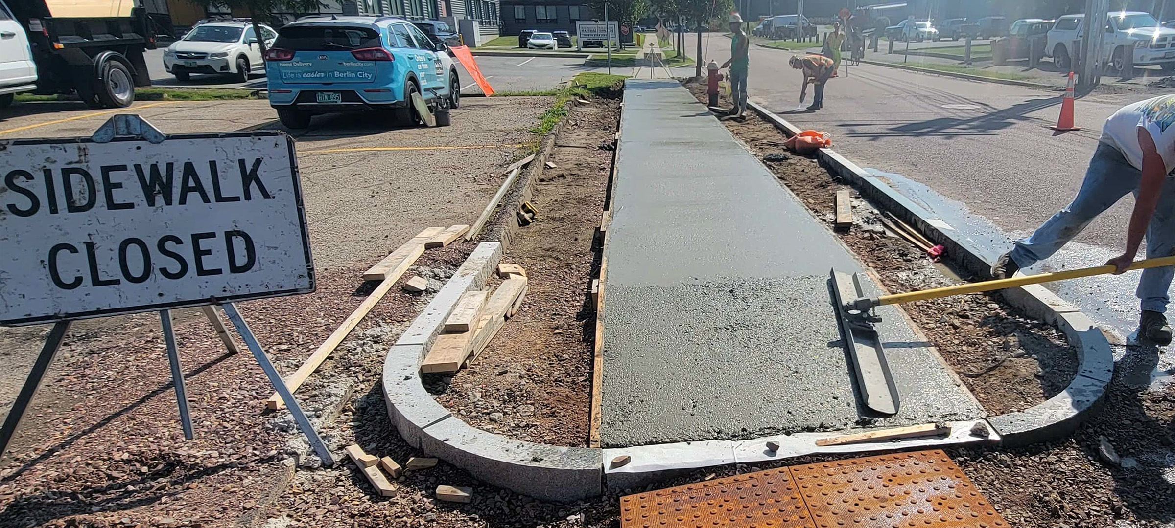 Freshly poured concrete sidewalk at the northwest corner of Flynn Avenue at the Parkway.