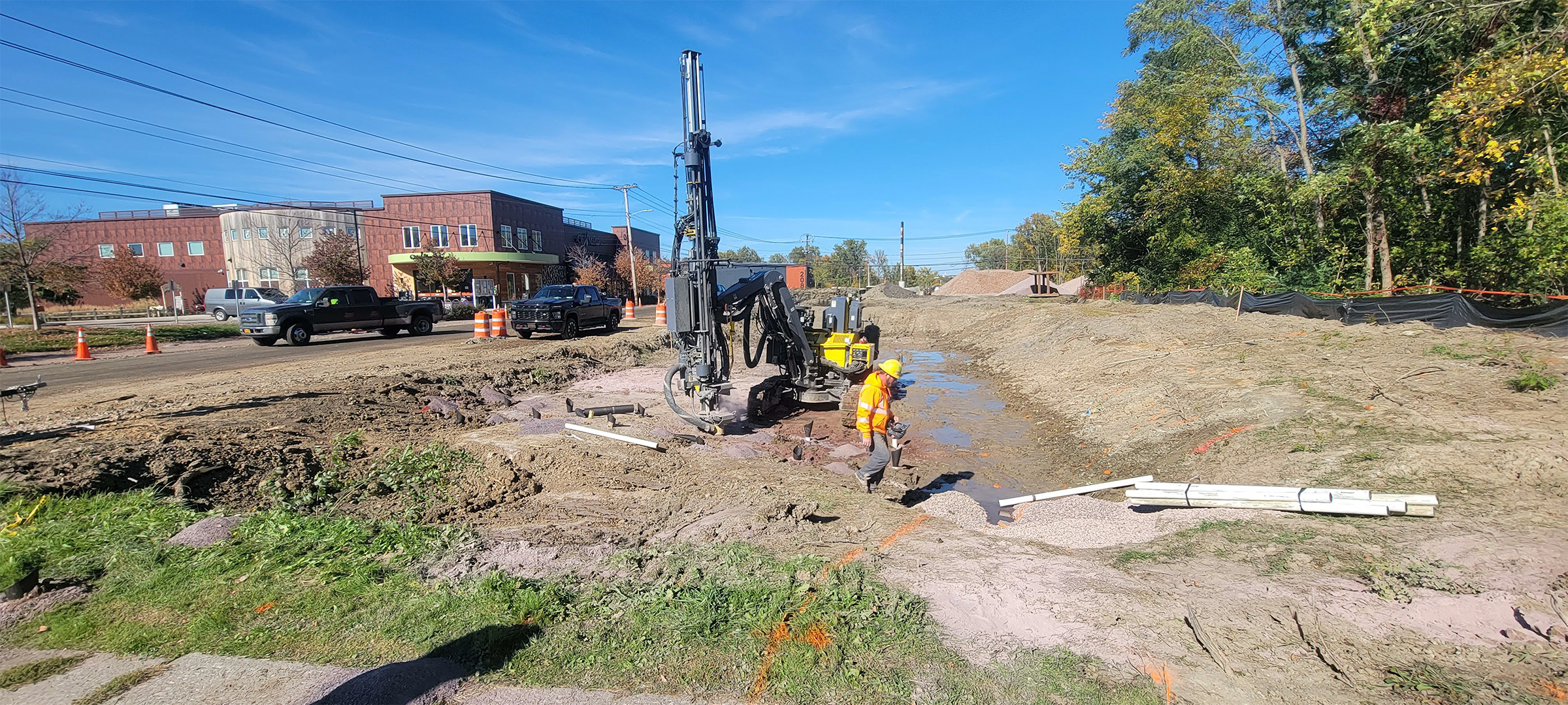 Crews drilling in preparation for blasting to remove ledge along the east side of Briggs Street just south of Flynn Avenue.