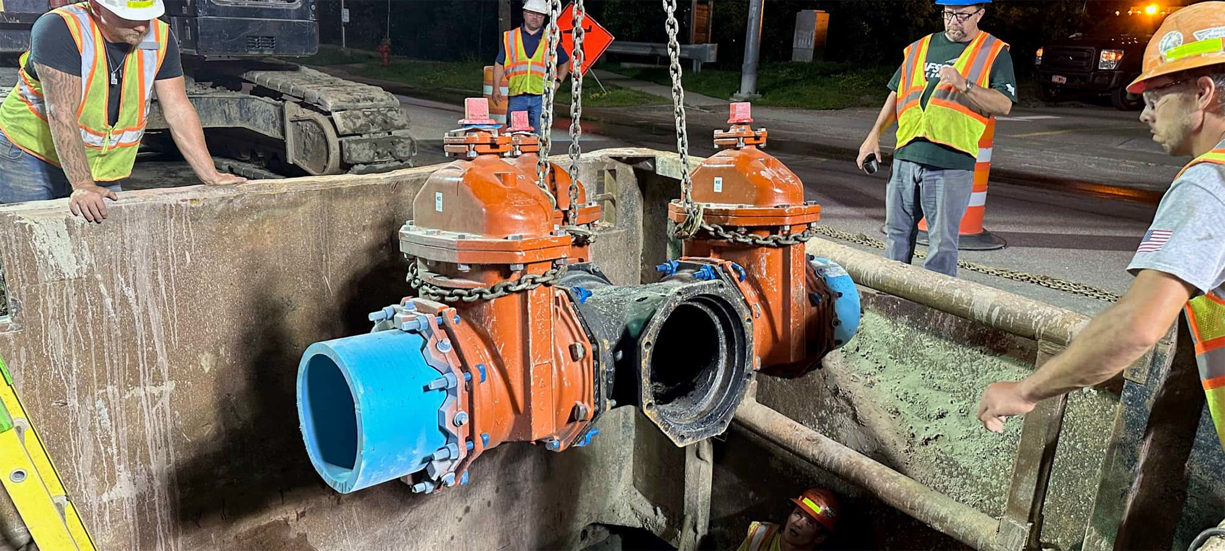 The installation of the four-way water valve assembly at the intersection of Pine Street at Lakeside Avenue at night to reduce impacts to the public.