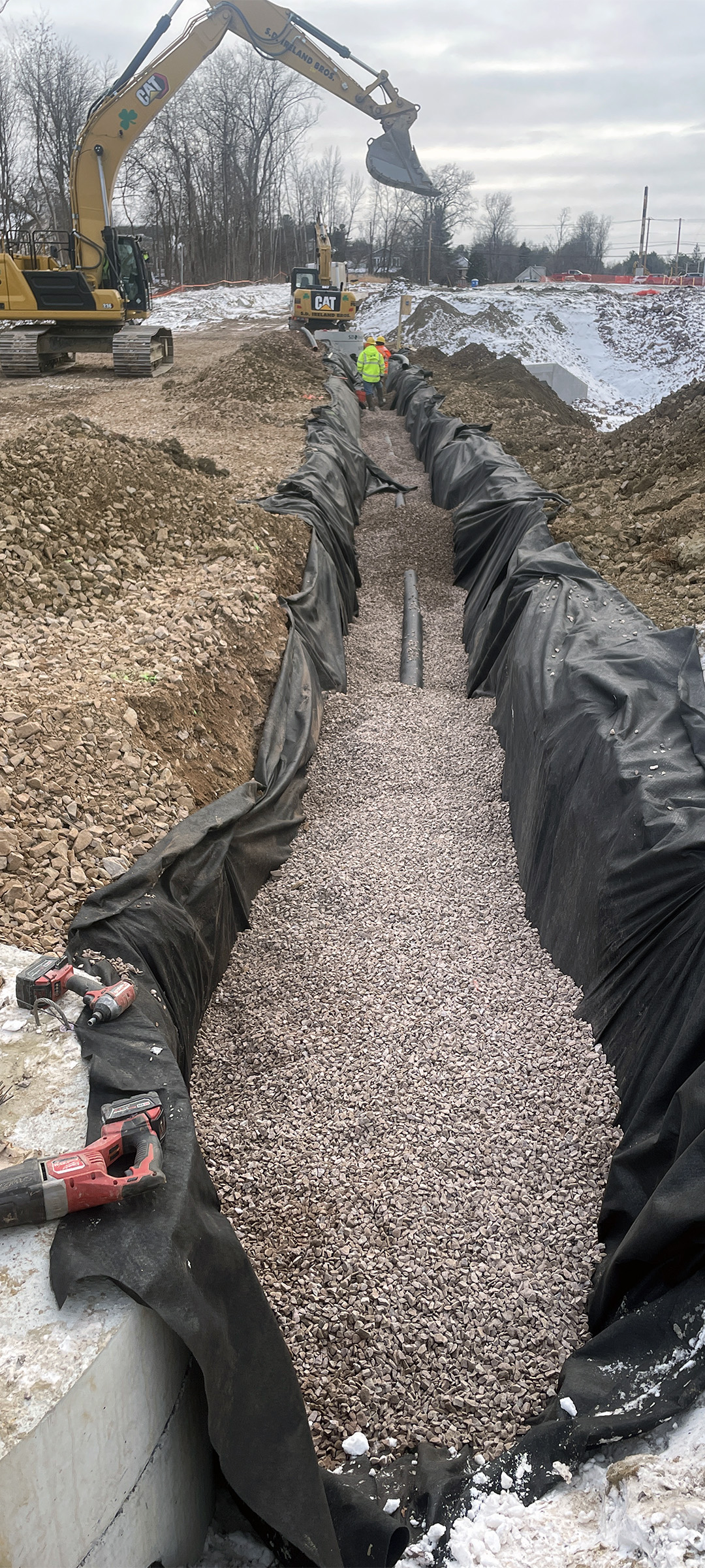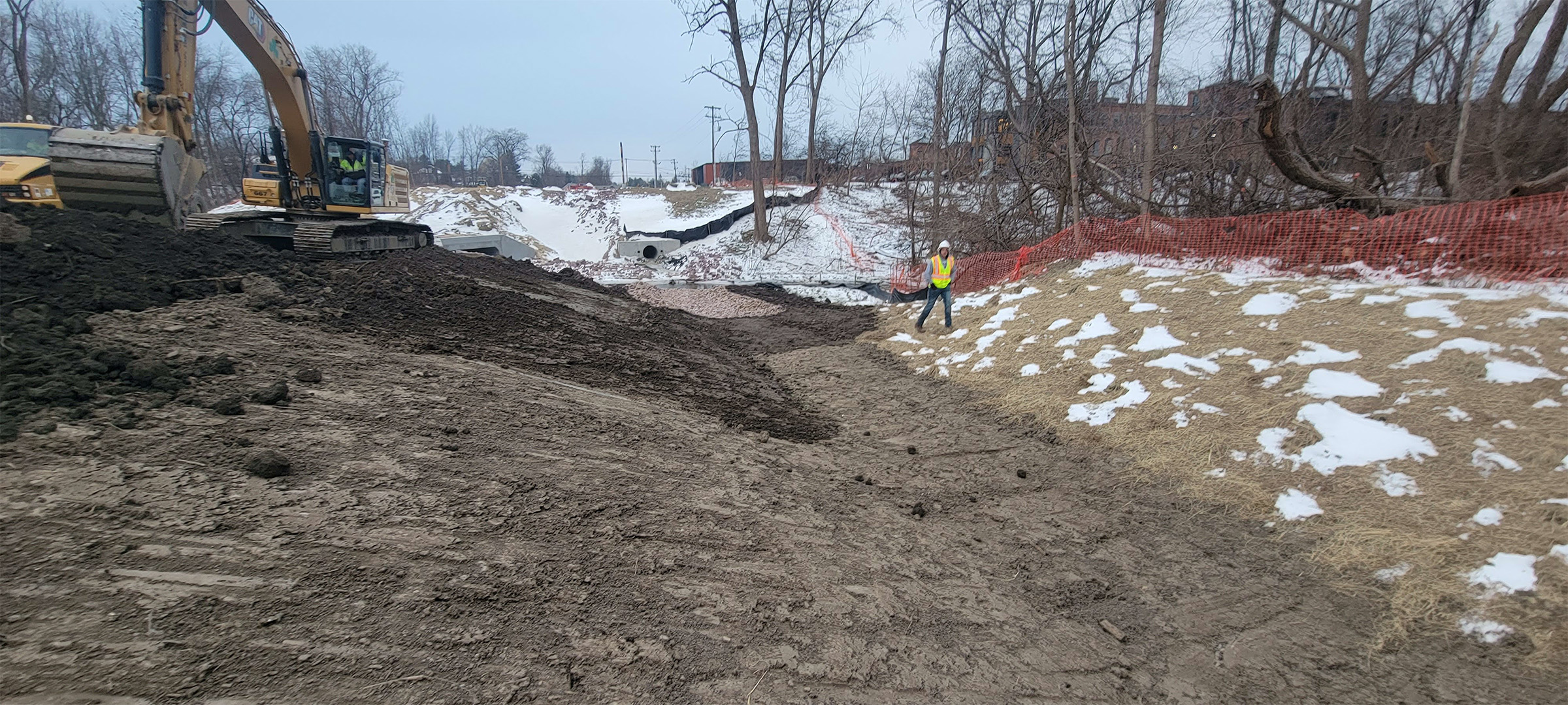 The Champlain Parkway included several stormwater features including the construction of a stormwater detention pond near Englesby Brook. Pictured installation of drainage pipe.