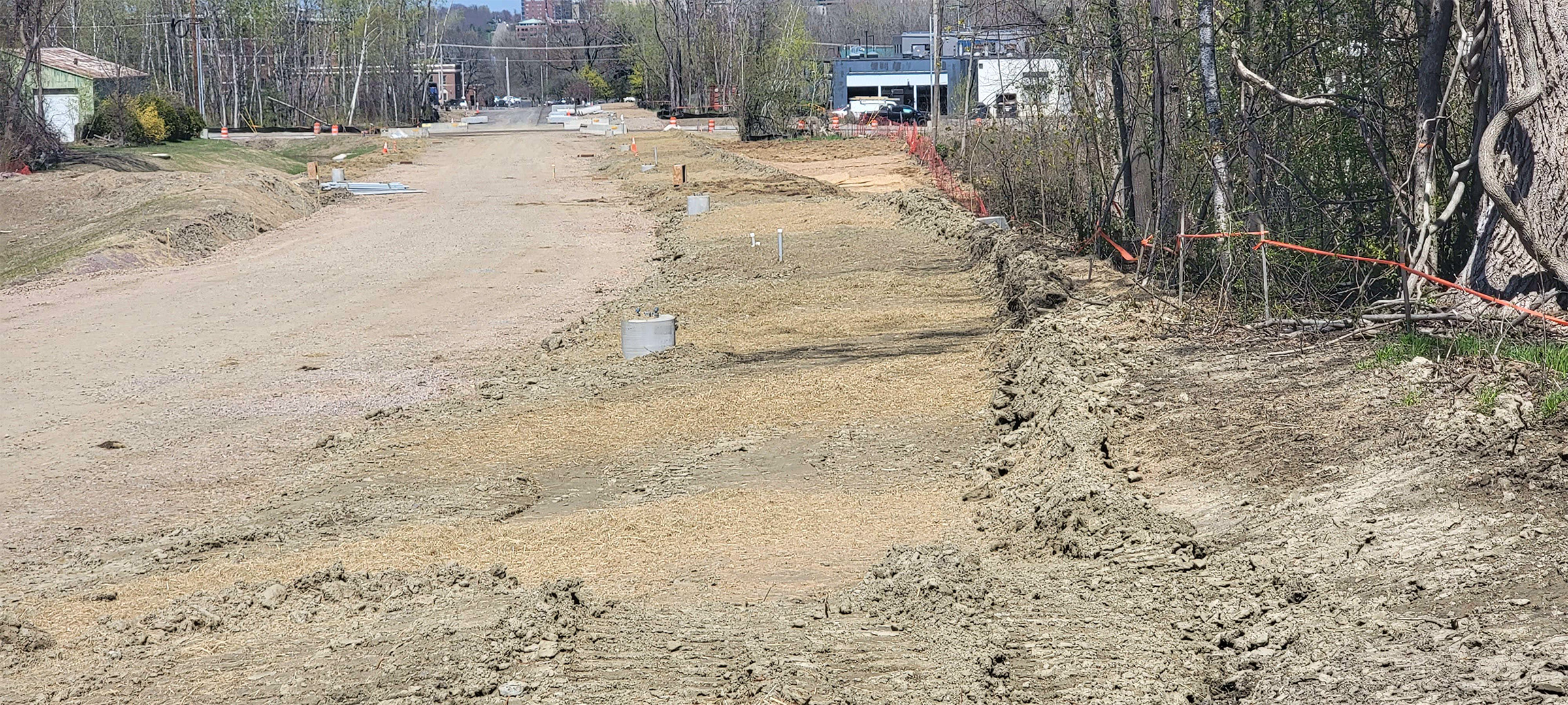 Grading the shared use path along Pine Street in preparation for the installation dense grade subbase material.