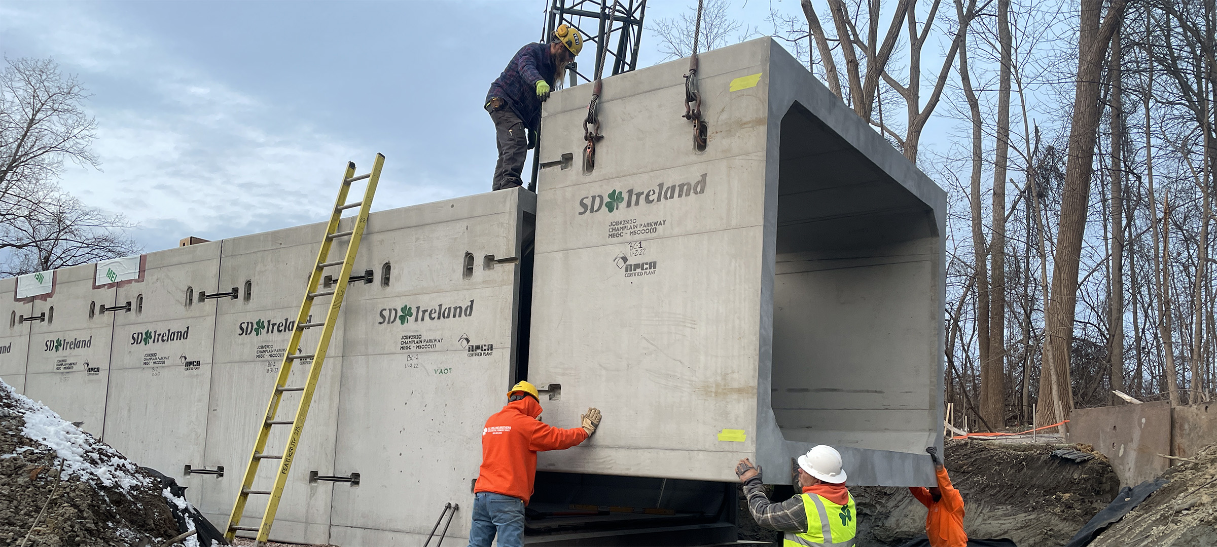 The Champlain Parkway Project includes several stormwater features including a box culvert for the Englesby Brook. Pictured placement of the precast box culvert segments.
