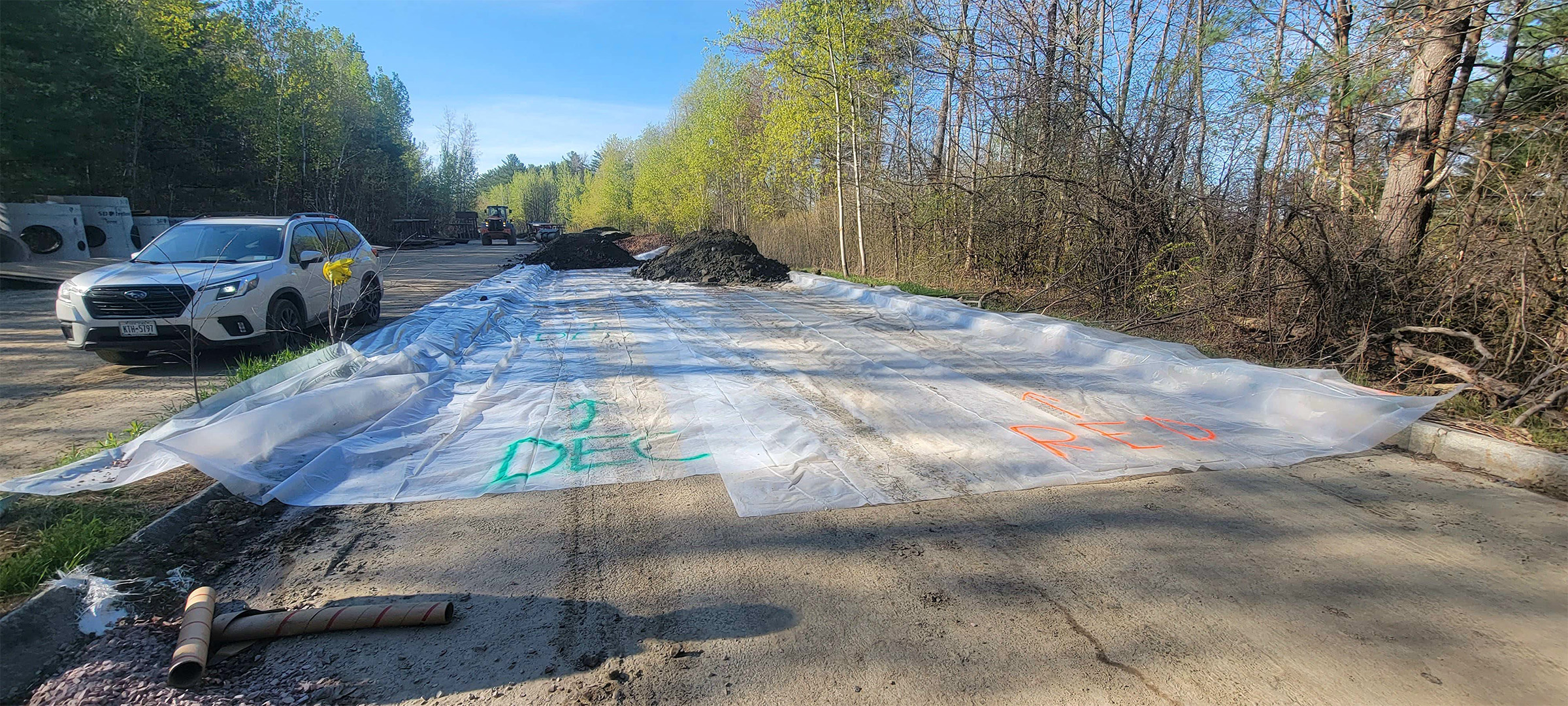The Champlain Parkway included several stormwater features including the construction of a stormwater detention pond near Englesby Brook. Pictured geomembrane liner.