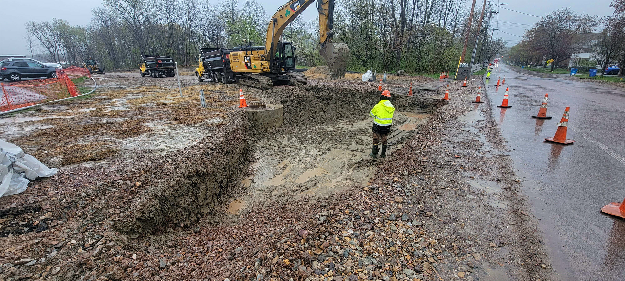 Excavation for the installation of the swirl chamber (new stormwater infrastructure) and the diversion structures in the parking area at the Flynn Avenue Co-op.