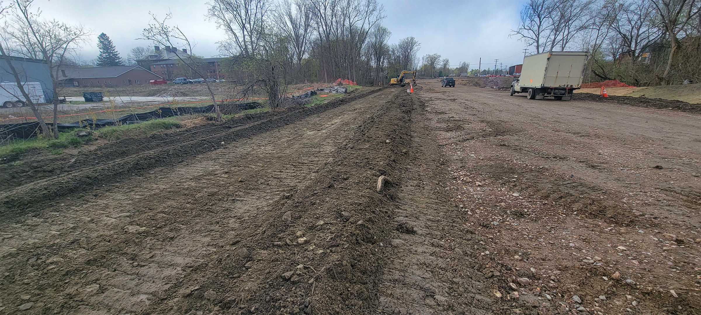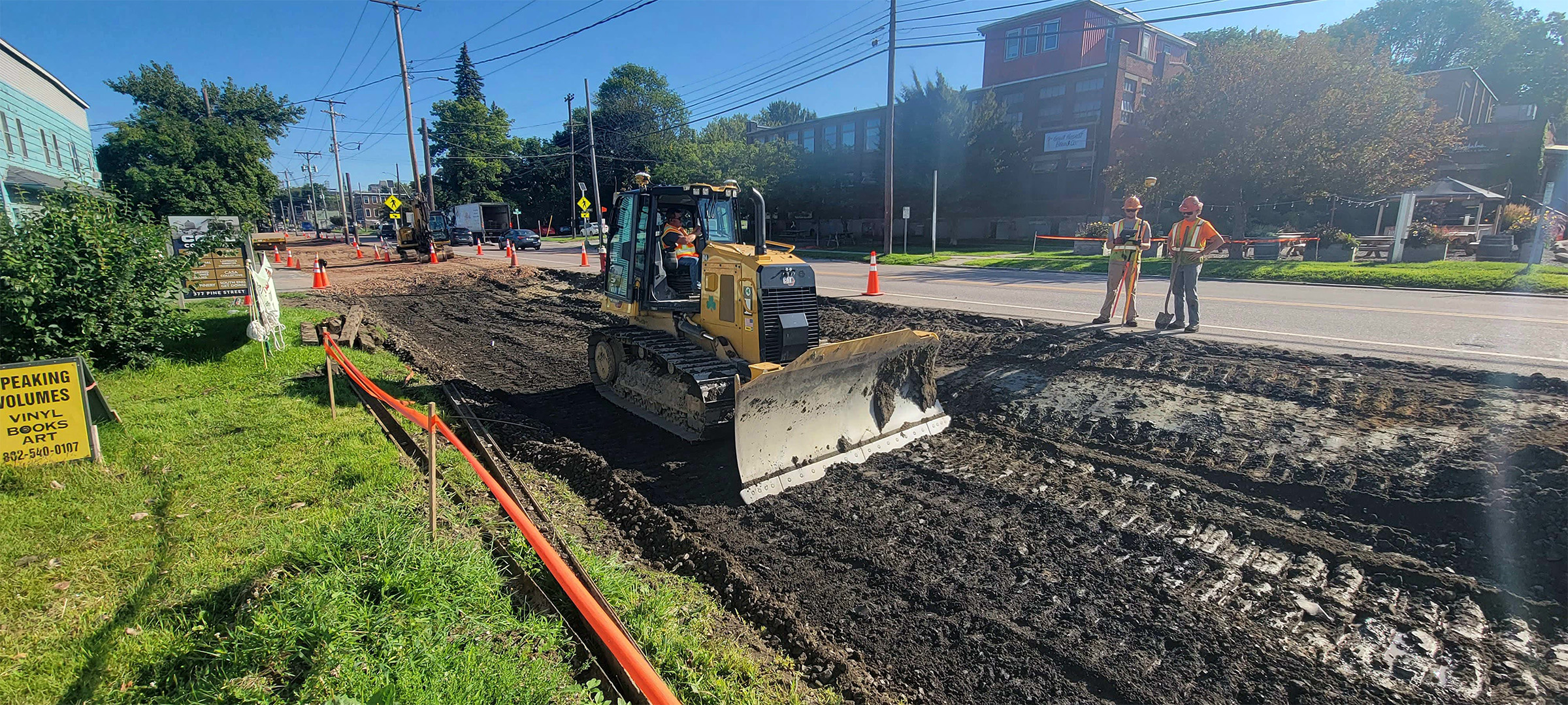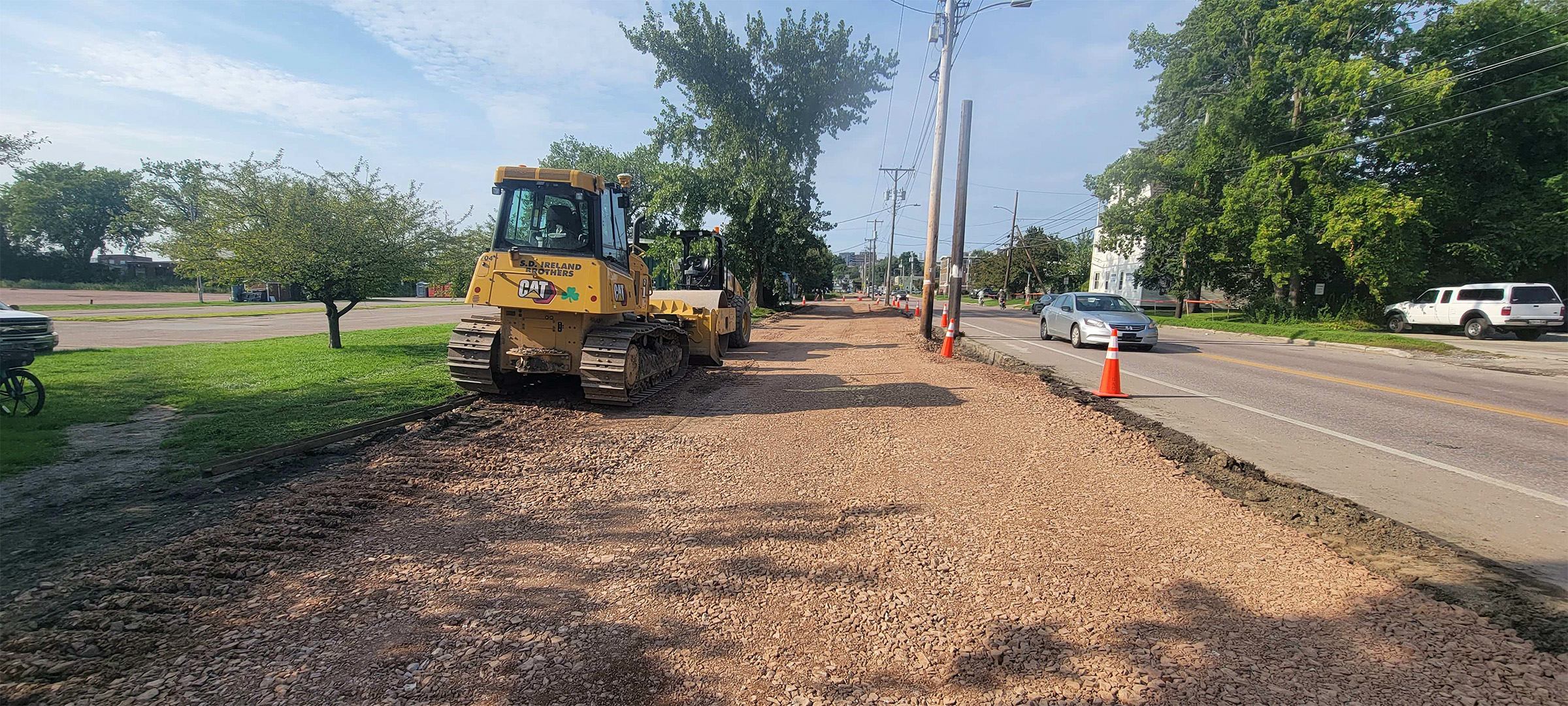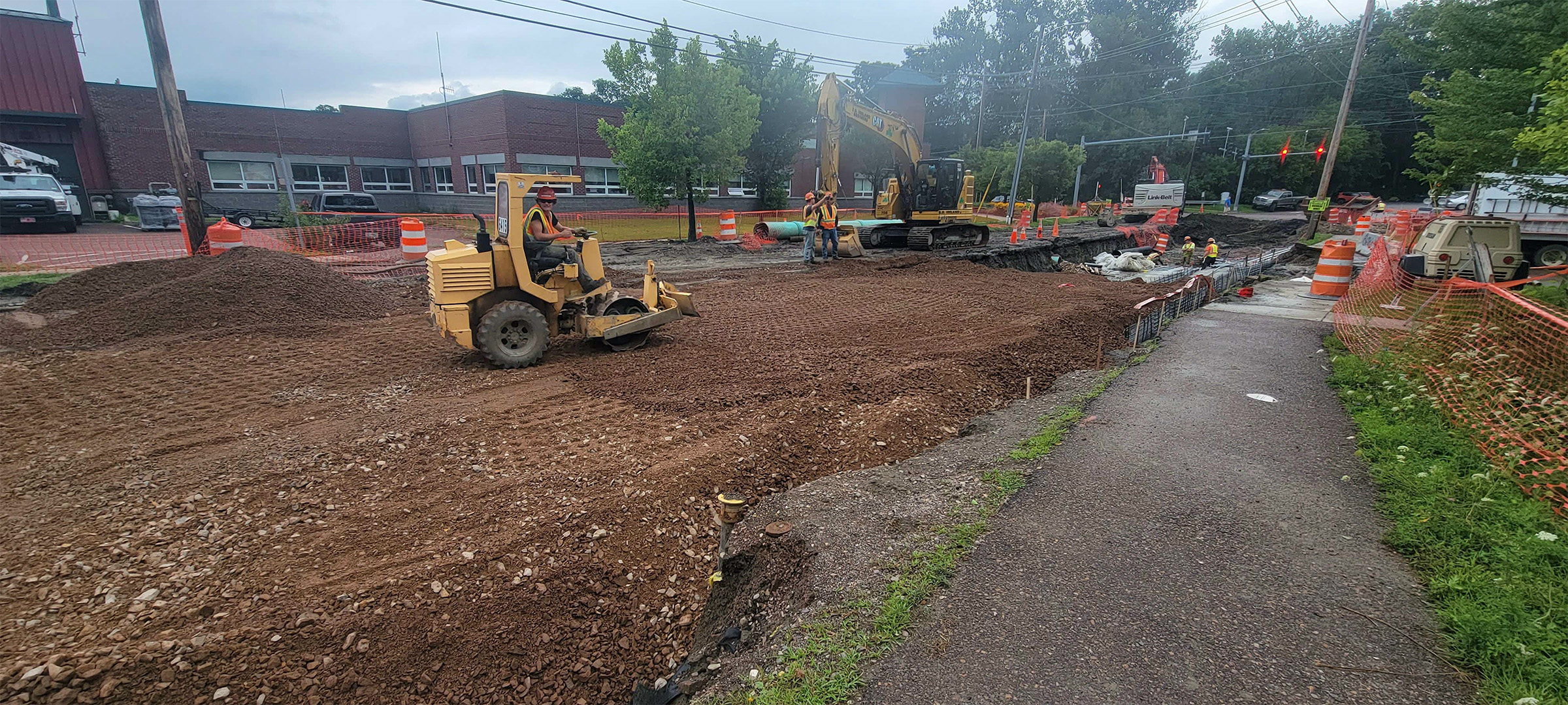 Grading the shared use path along Pine Street in preparation for the installation dense grade subbase material.