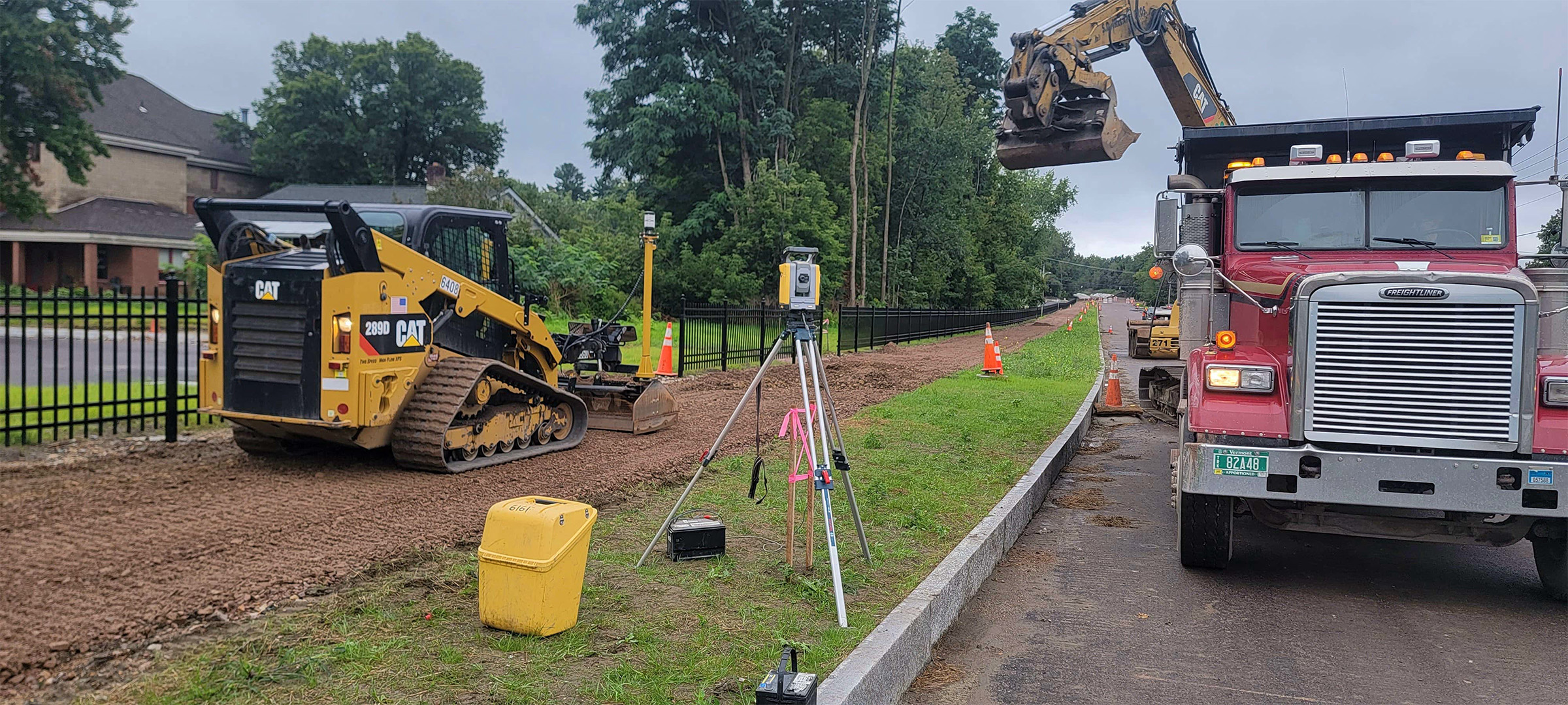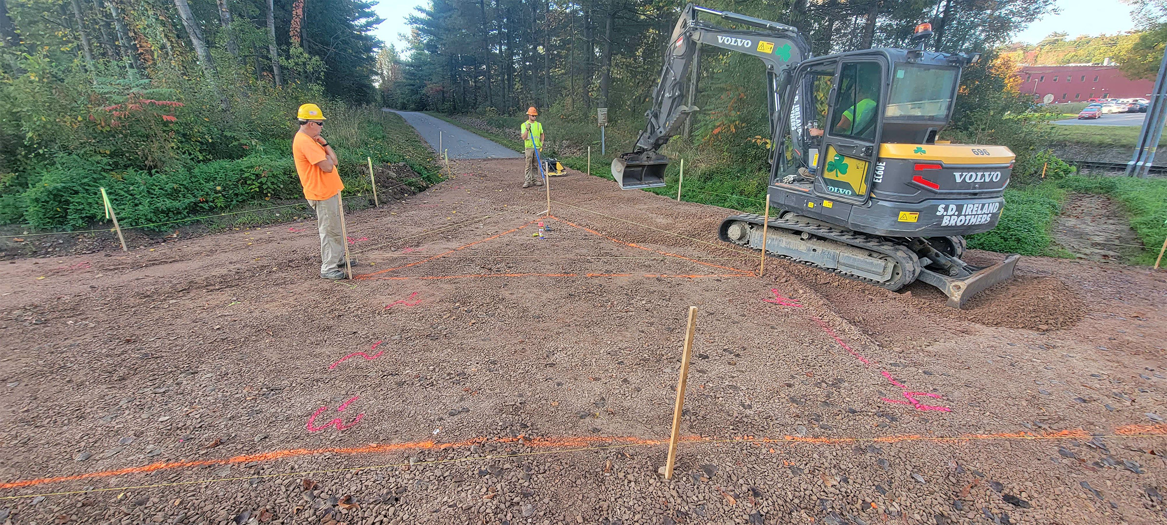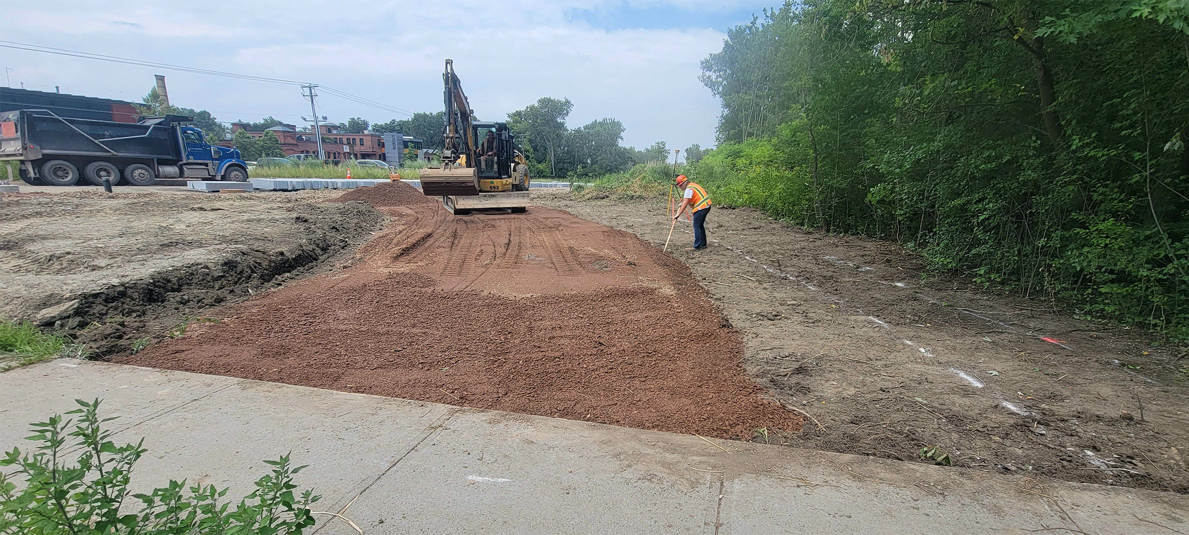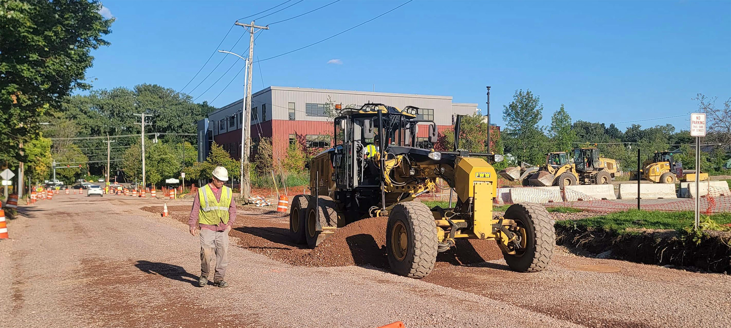 Grading the shared use path along Pine Street in preparation for the installation dense grade subbase material.