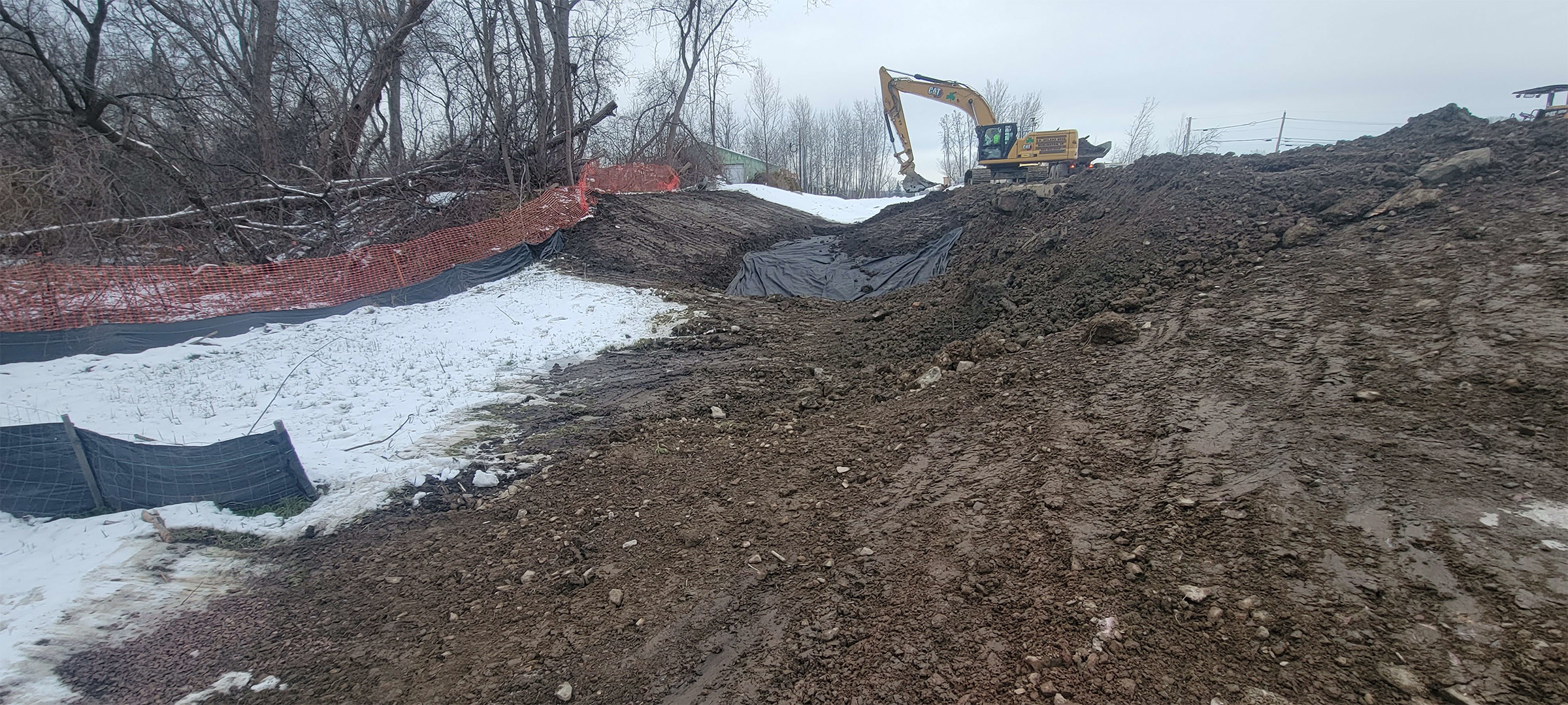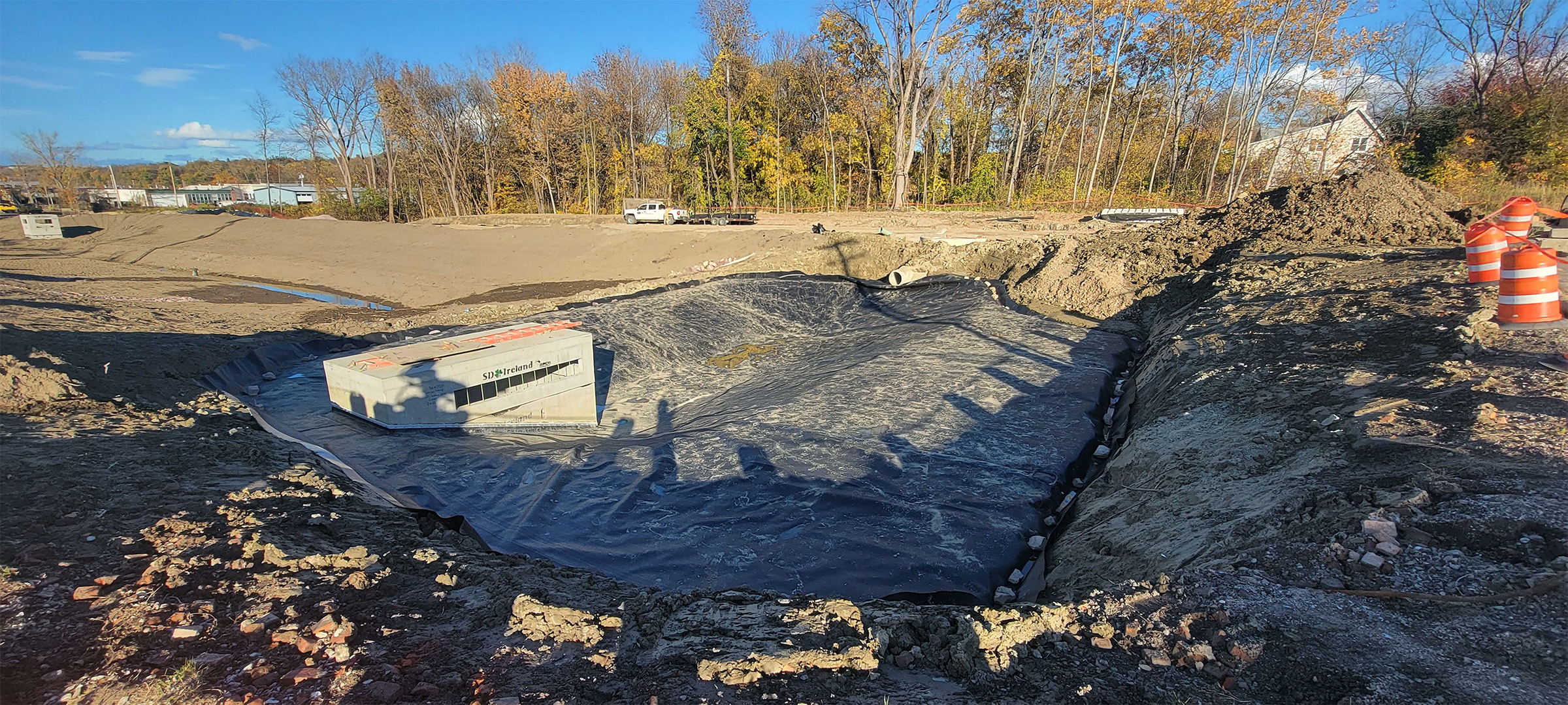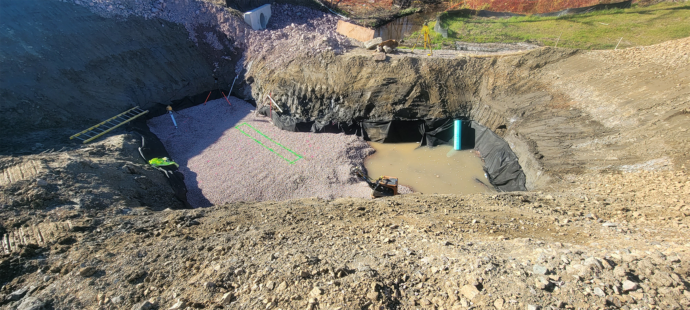 The Champlain Parkway included several stormwater features including the construction of a stormwater detention pond near Englesby Brook. Pictured geomembrane liner.