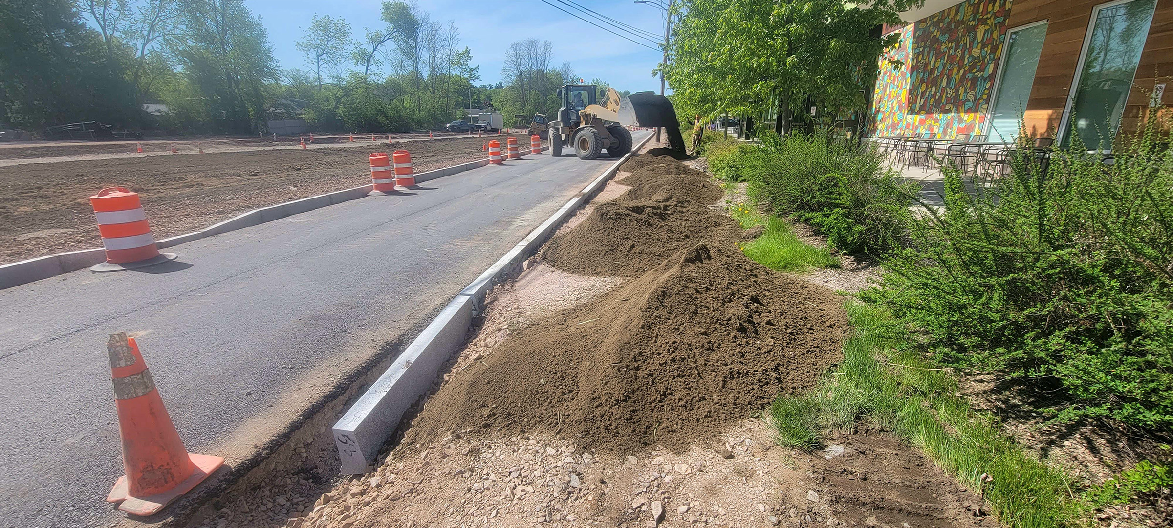 Installation of topsoil behind the newly installed granite curb on Briggs Street.