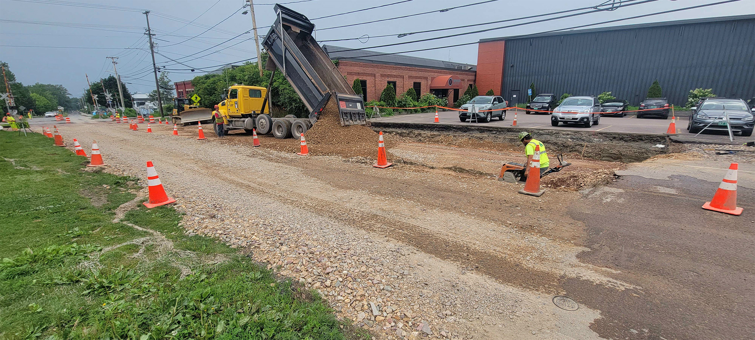 Installation of dense grade subbase material after waterline and duct bank installation was completed along Lakeside Avenue.