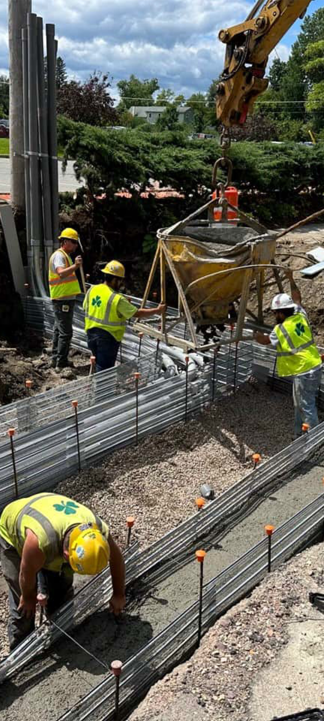 Aerial electrical and telecommunication utilities were relocated underground throughout portions of the south end. Crews installing underground electrical and telecommunication duct bank. This segment crosses the Champlain Parkway and Briggs Street.