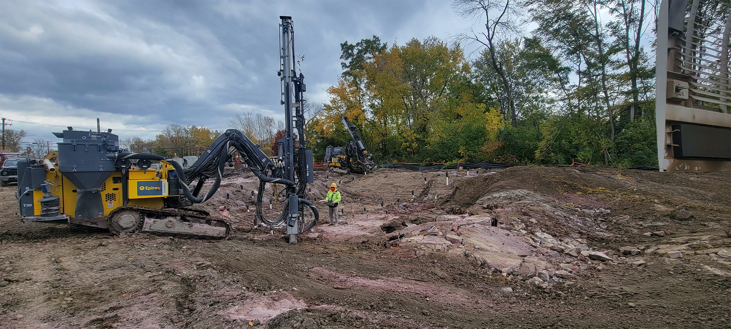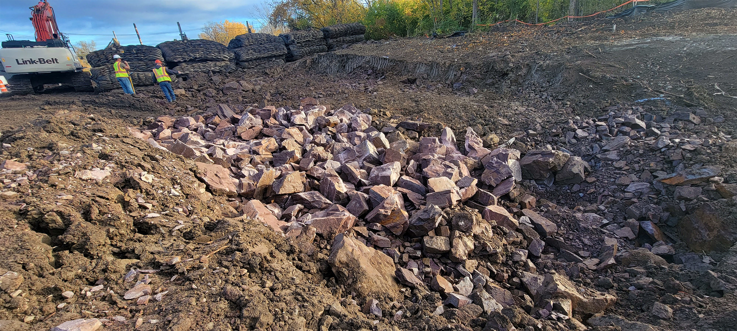 Blasted ledge for removal and preparation for additional blasting along the east side of Briggs Street just south of Flynn Avenue. Protective blasting mats pictured in the background.