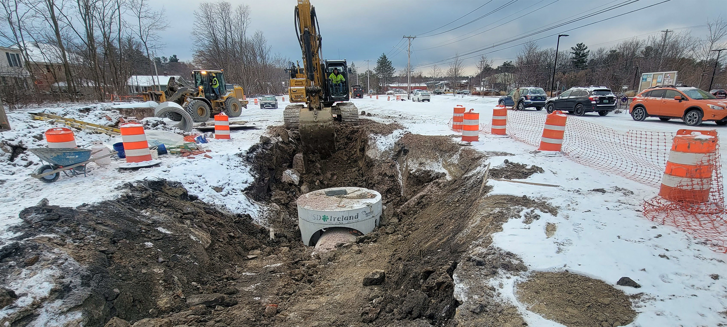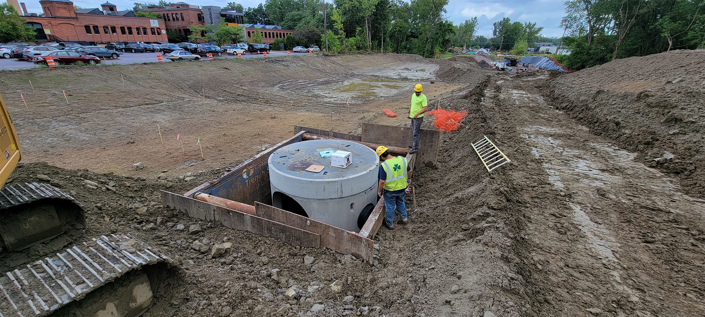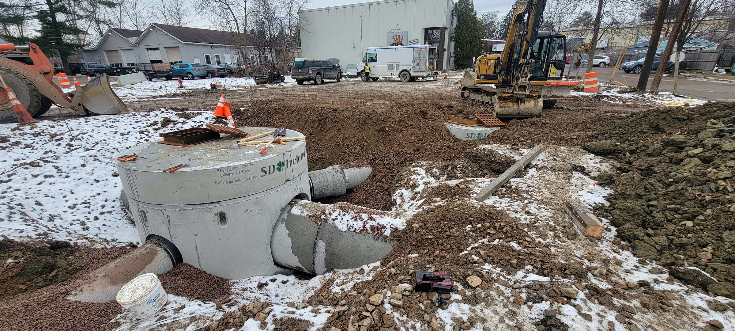 Excavation for the installation of the swirl chamber (new stormwater infrastructure) and the diversion structures in the parking area at the Flynn Avenue Co-op.