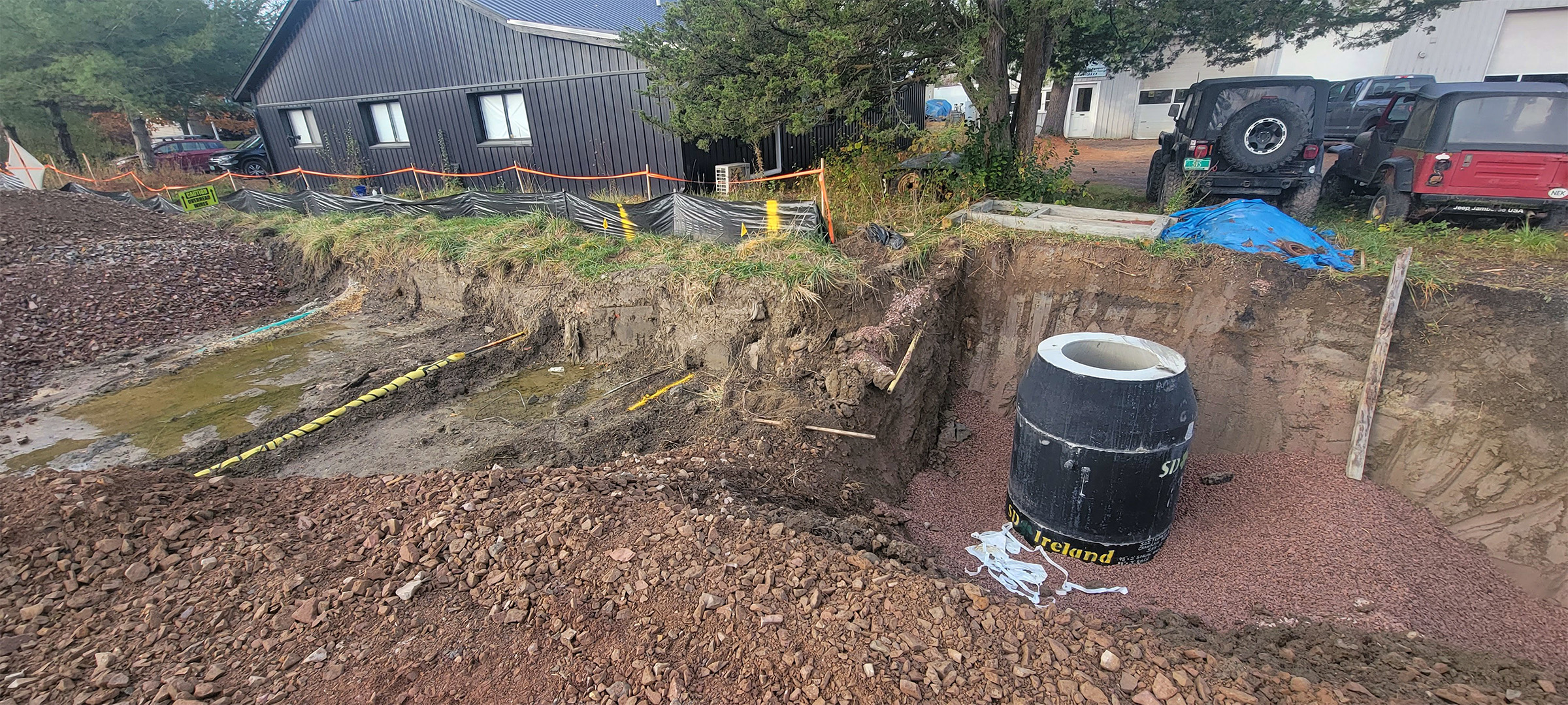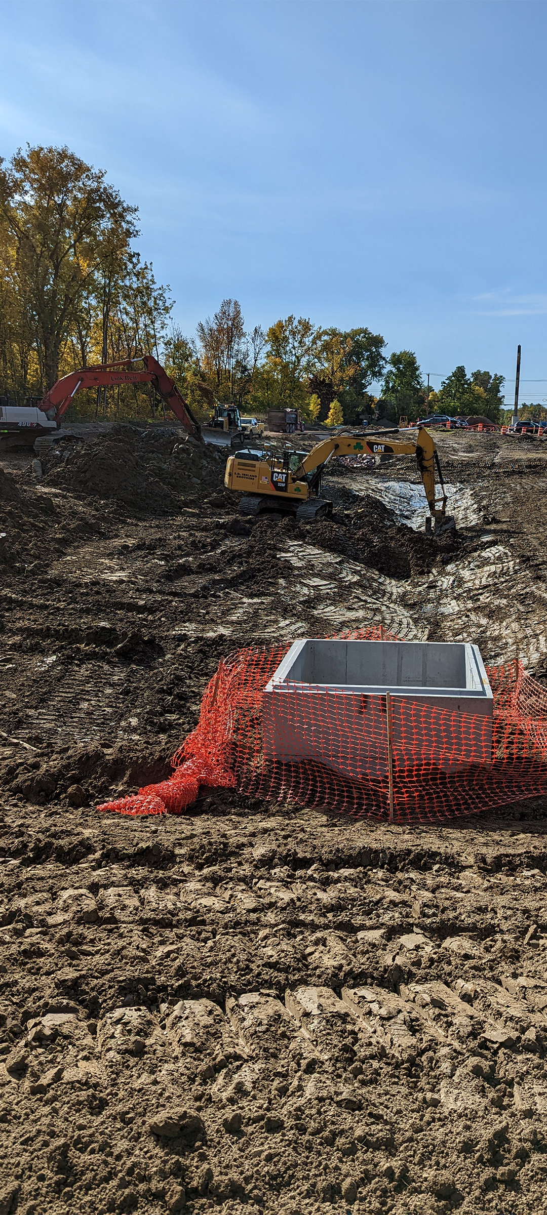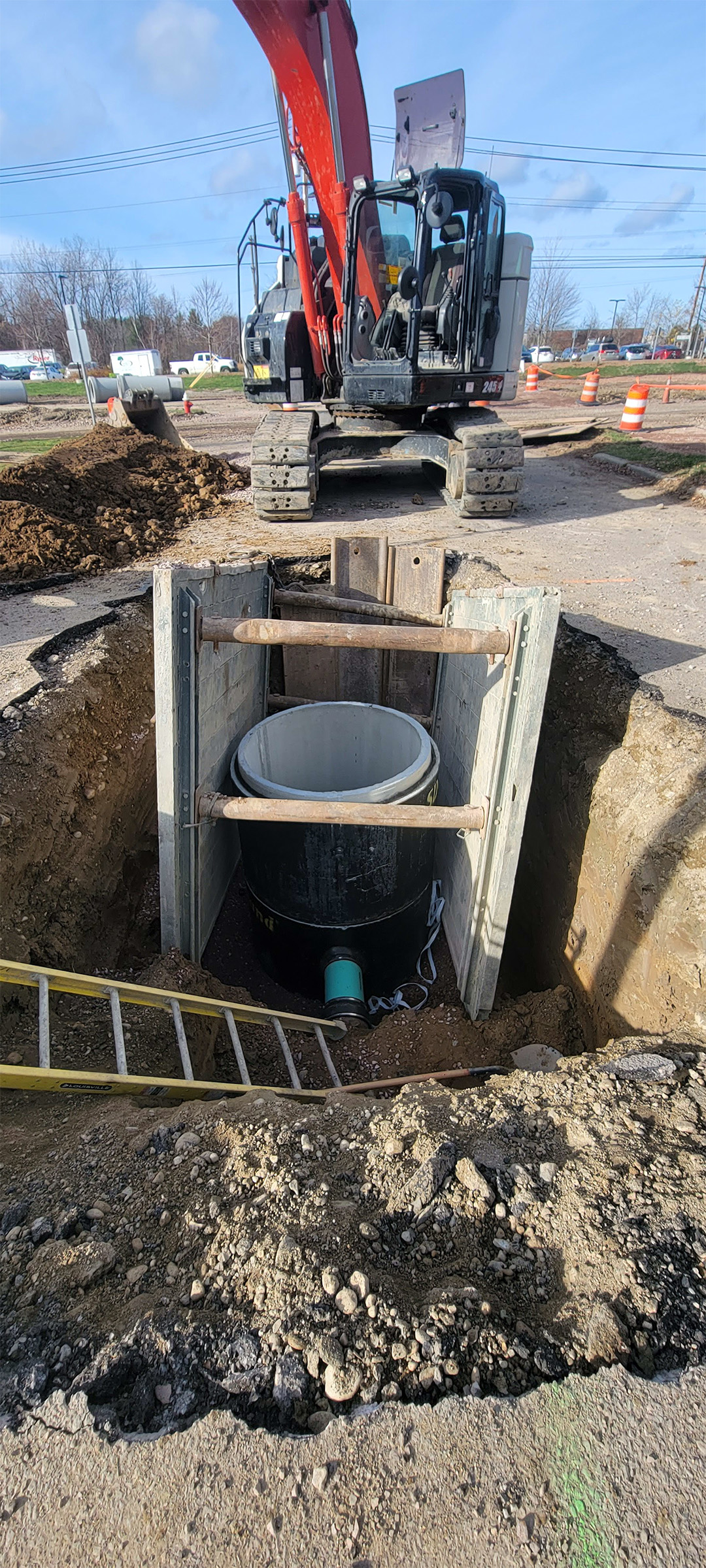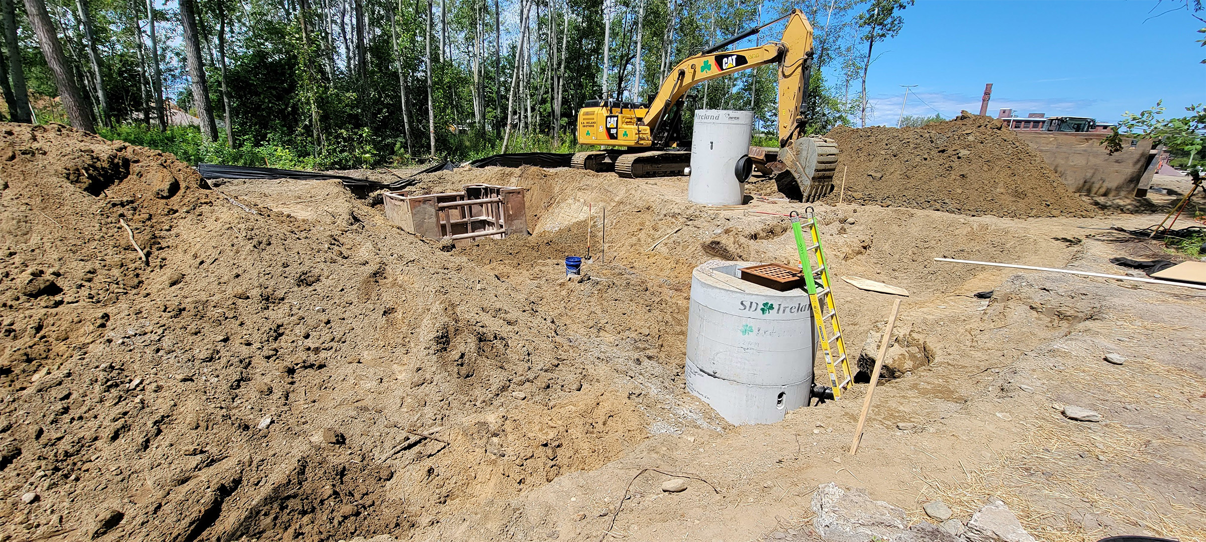 Excavation for the installation of the swirl chamber (new stormwater infrastructure) and the diversion structures in the parking area at the Flynn Avenue Co-op.
