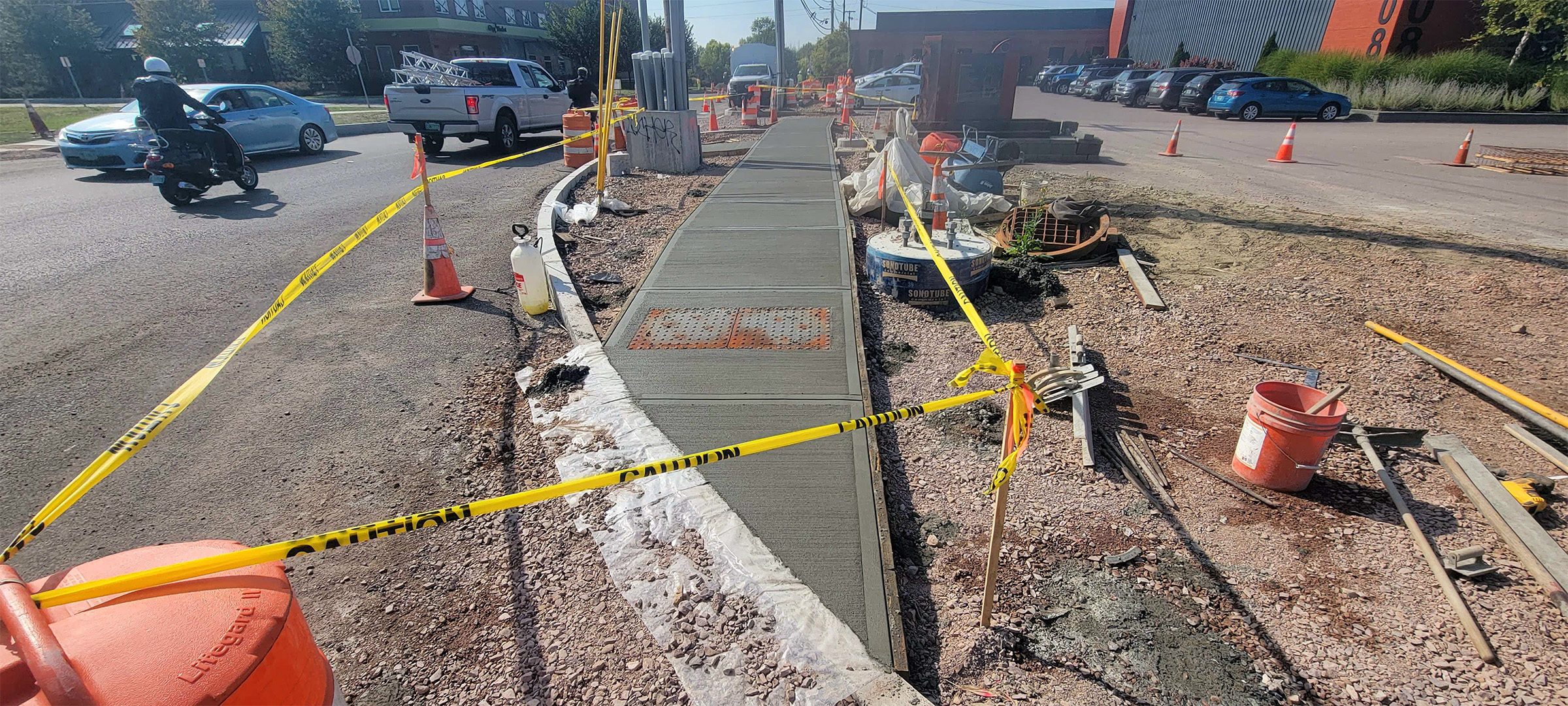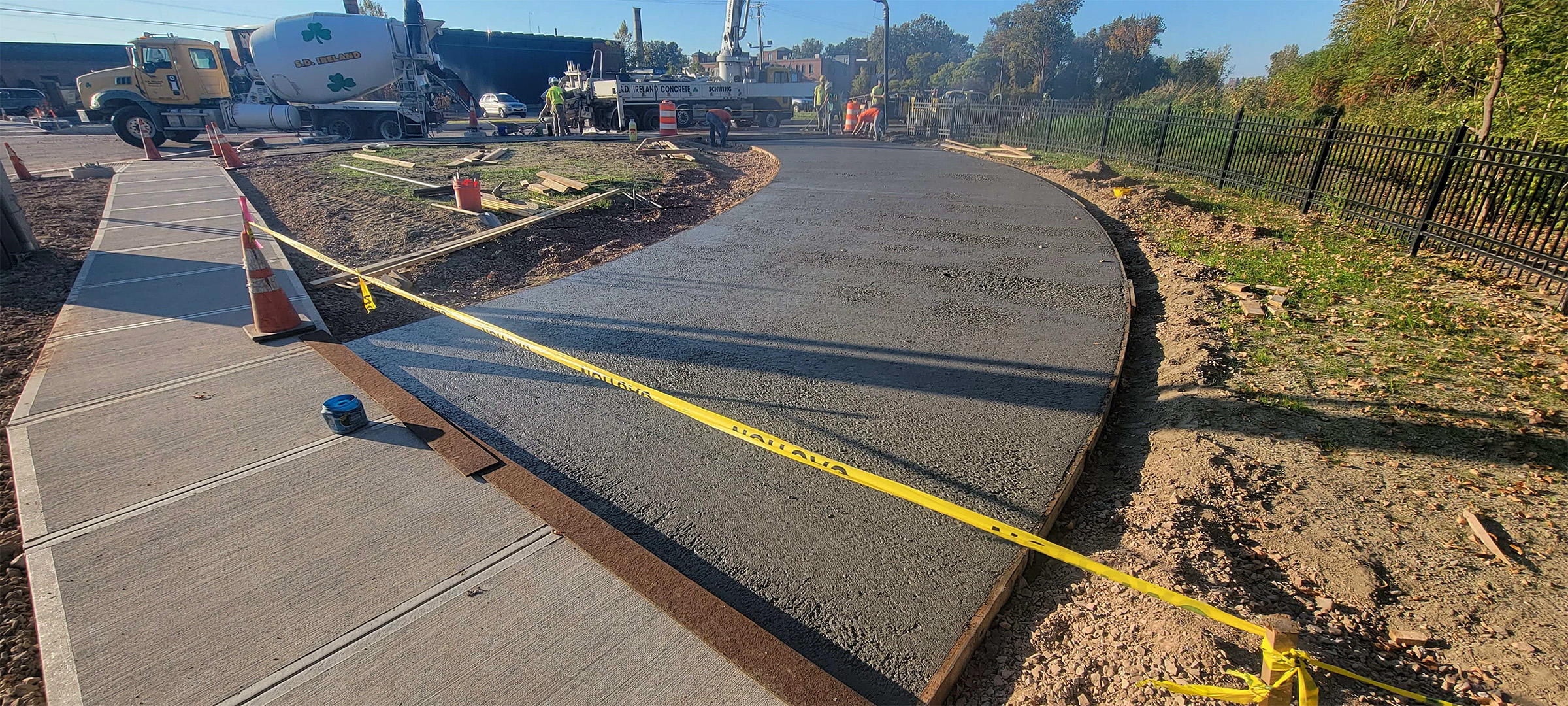 Freshly poured concrete sidewalk at the northwest corner of Flynn Avenue at the Parkway.