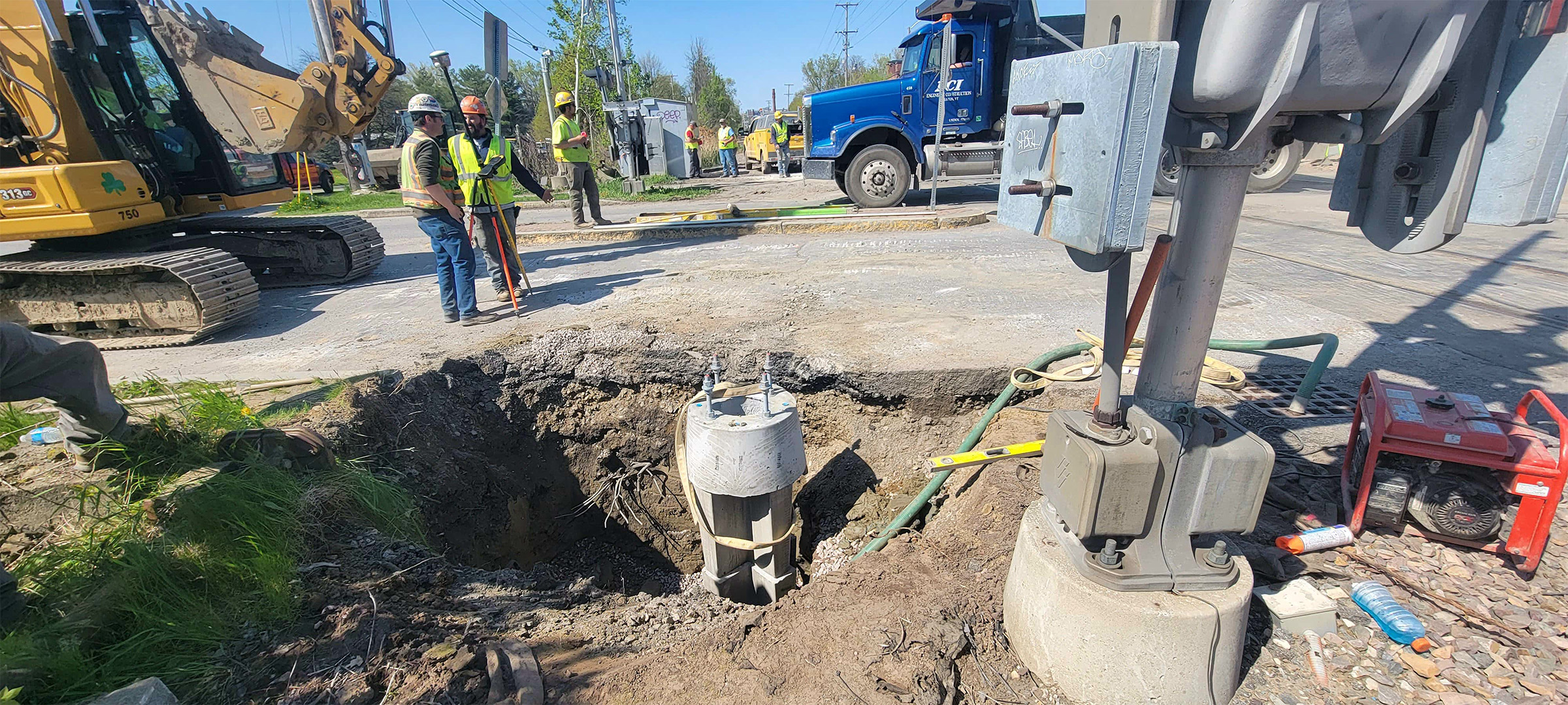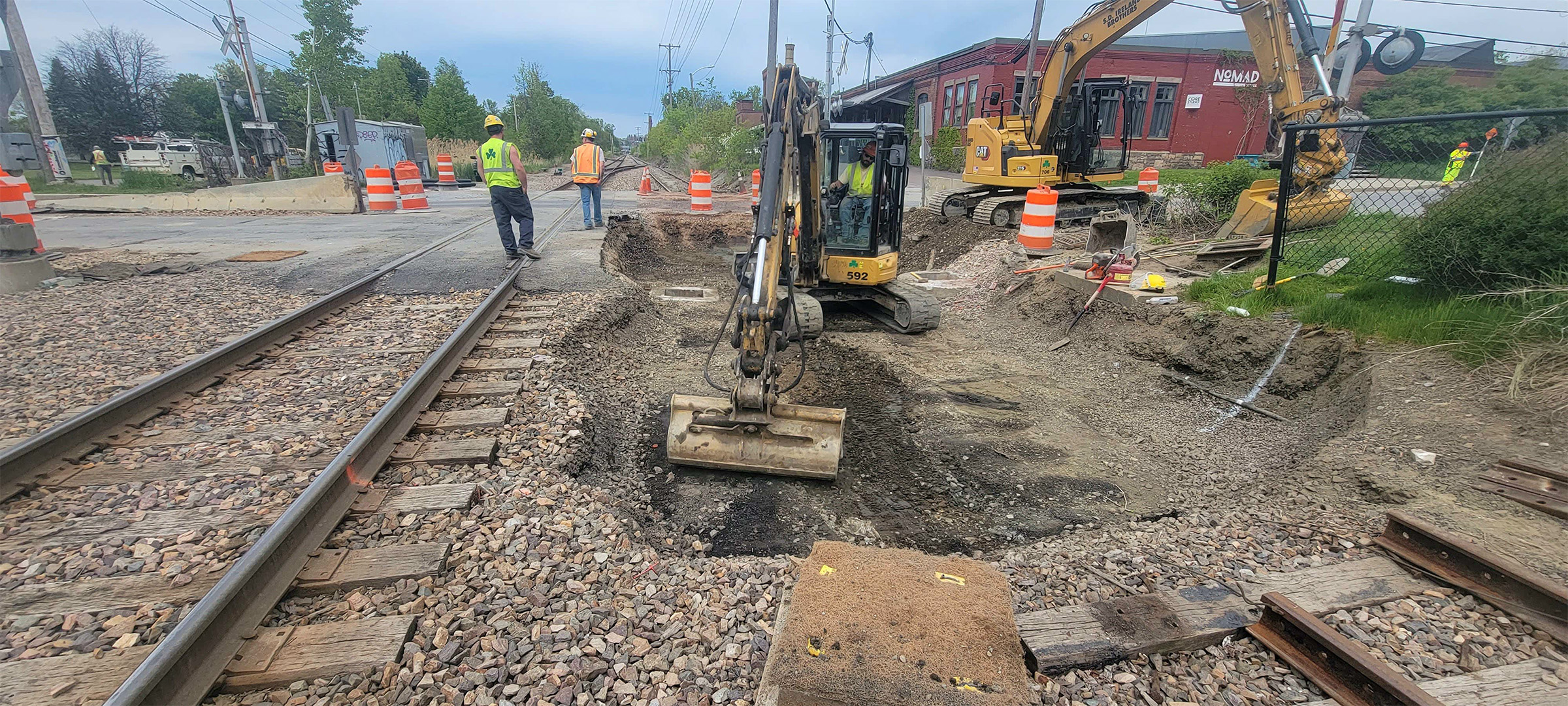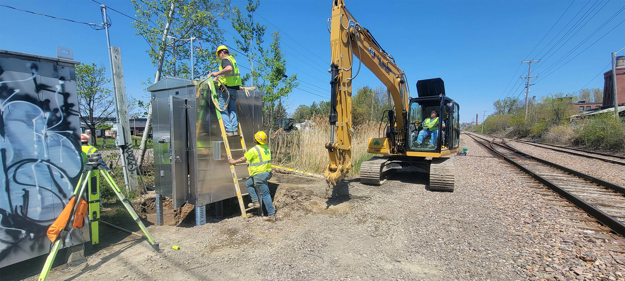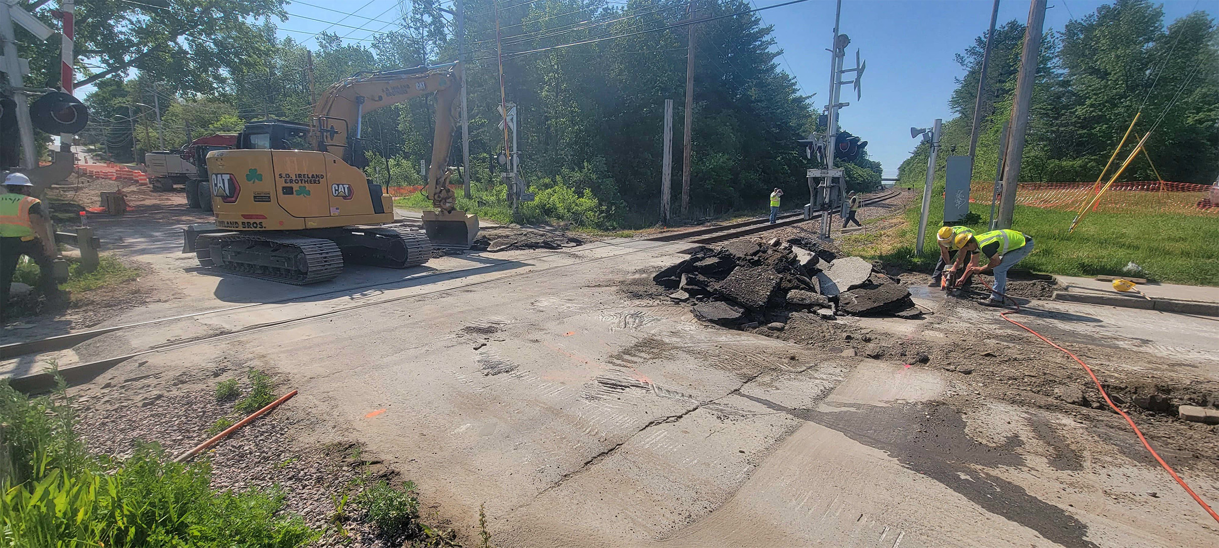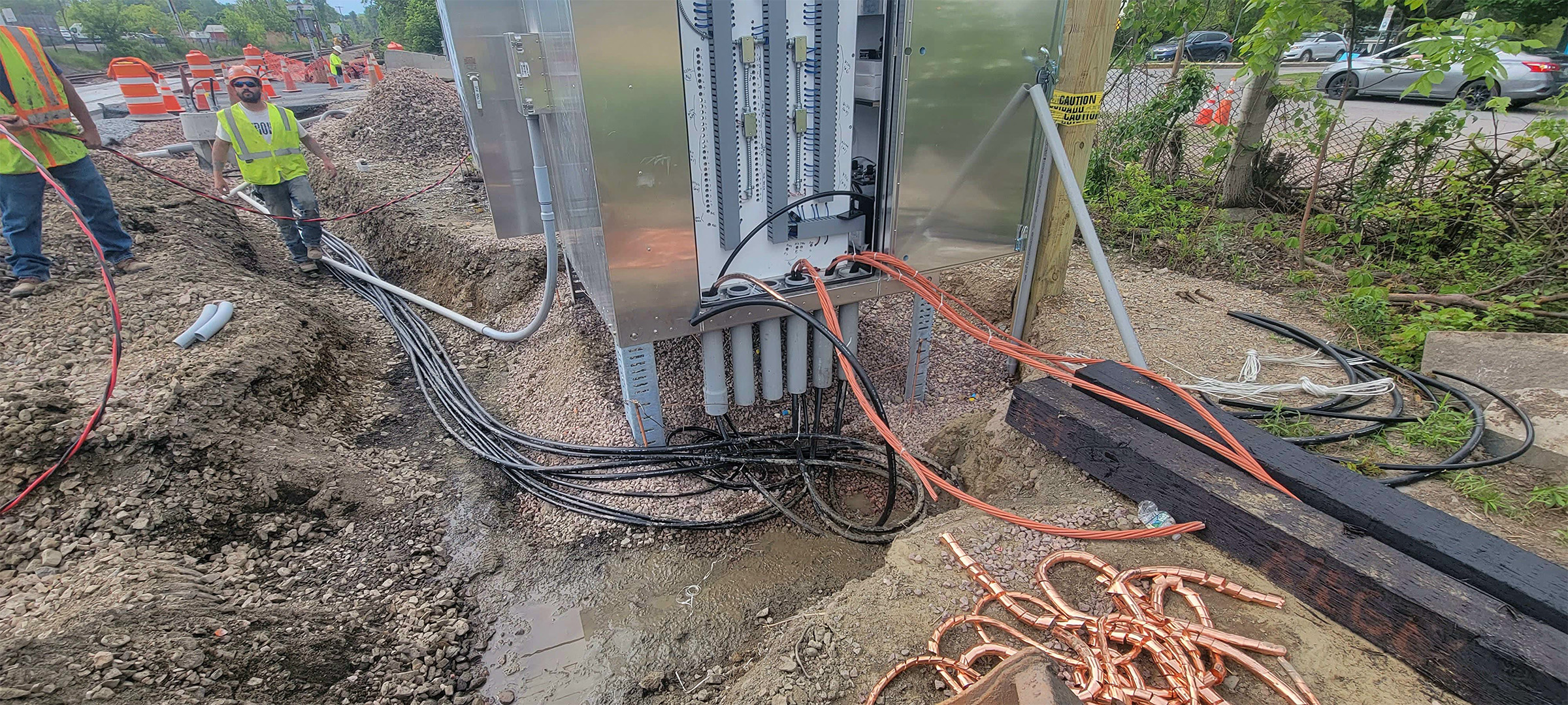 Crews running the cables for the railroad crossing signal at Flynn Avenue to the signal house.