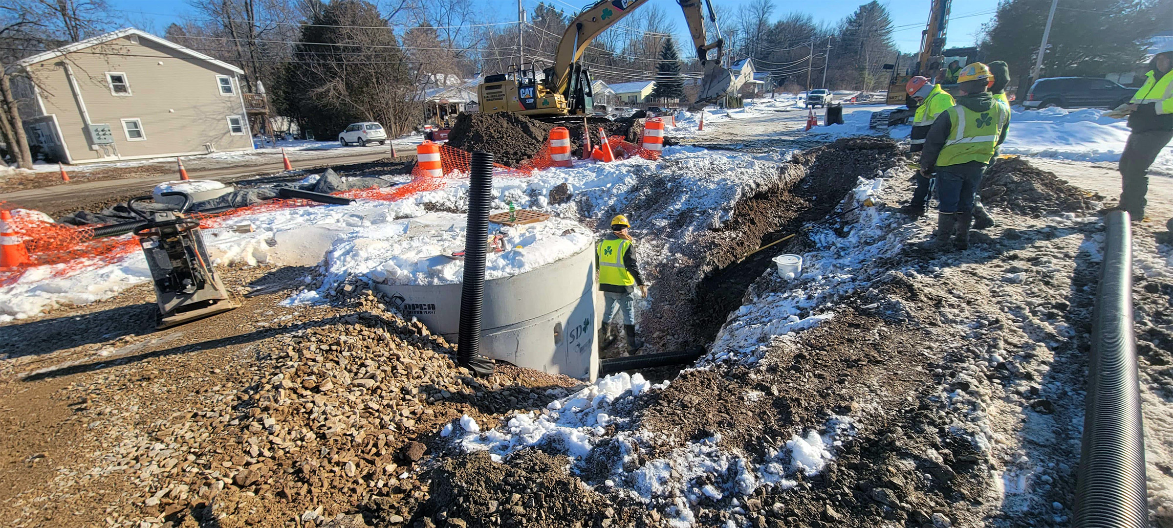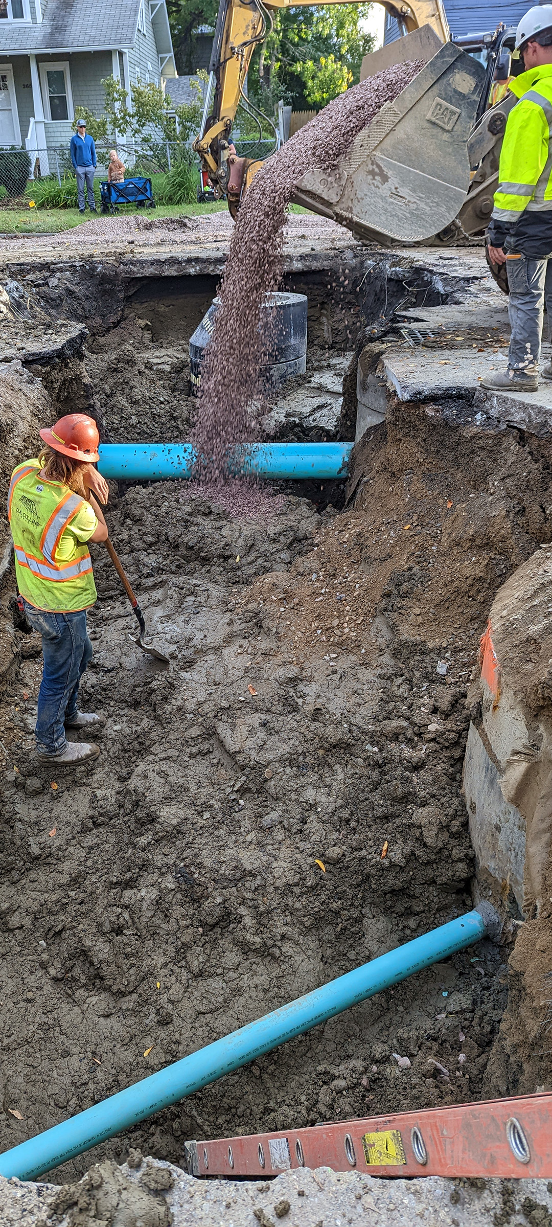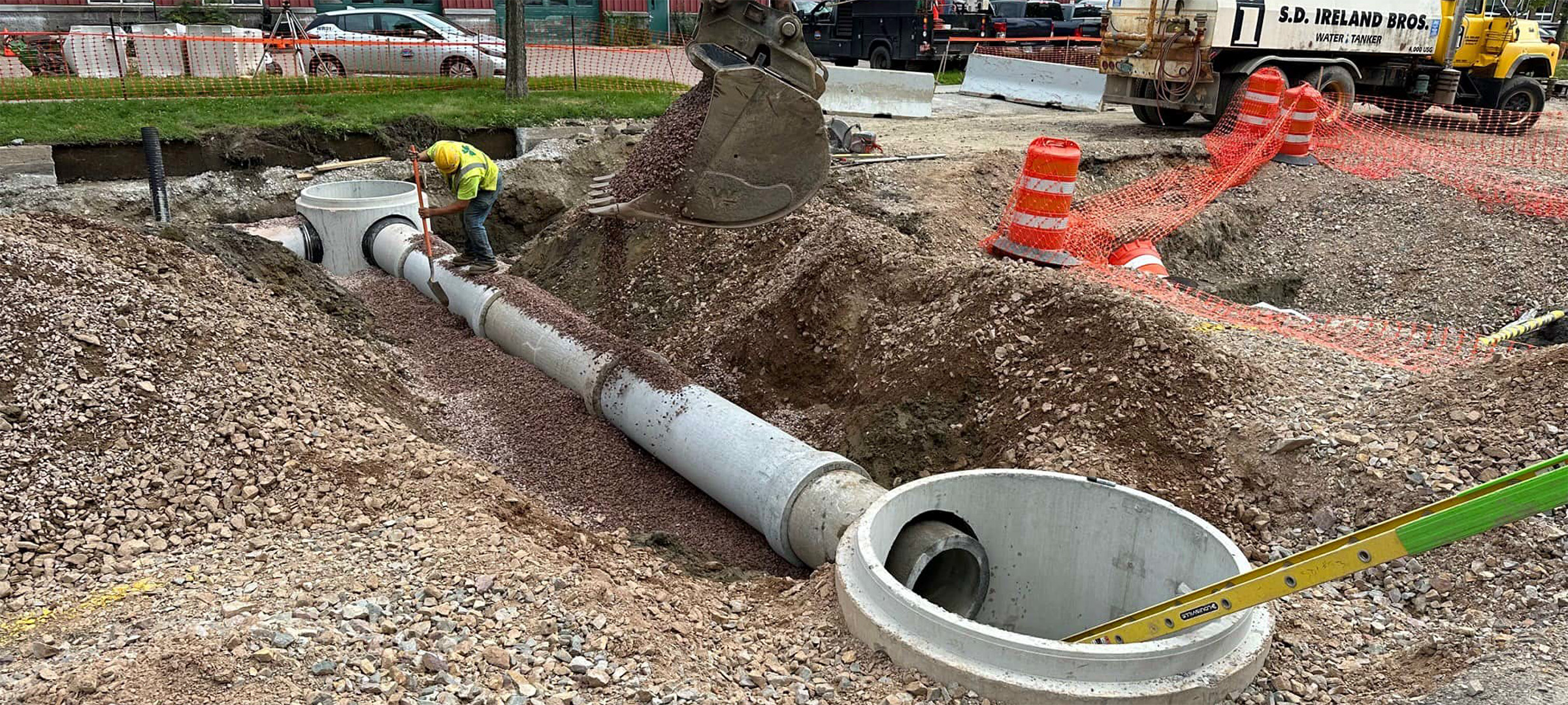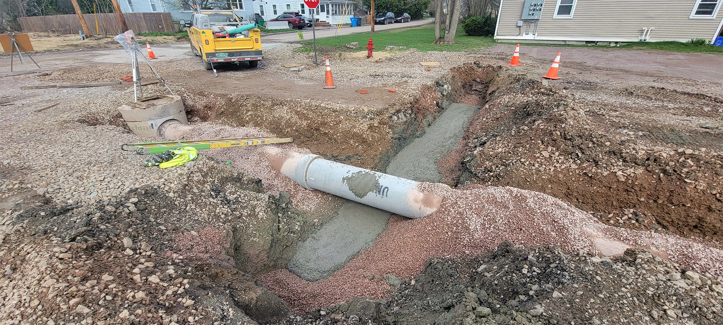 Crews install new sewer line throughout the south end to replace existing aging infrastructure. New sewer installation on Briggs Street.