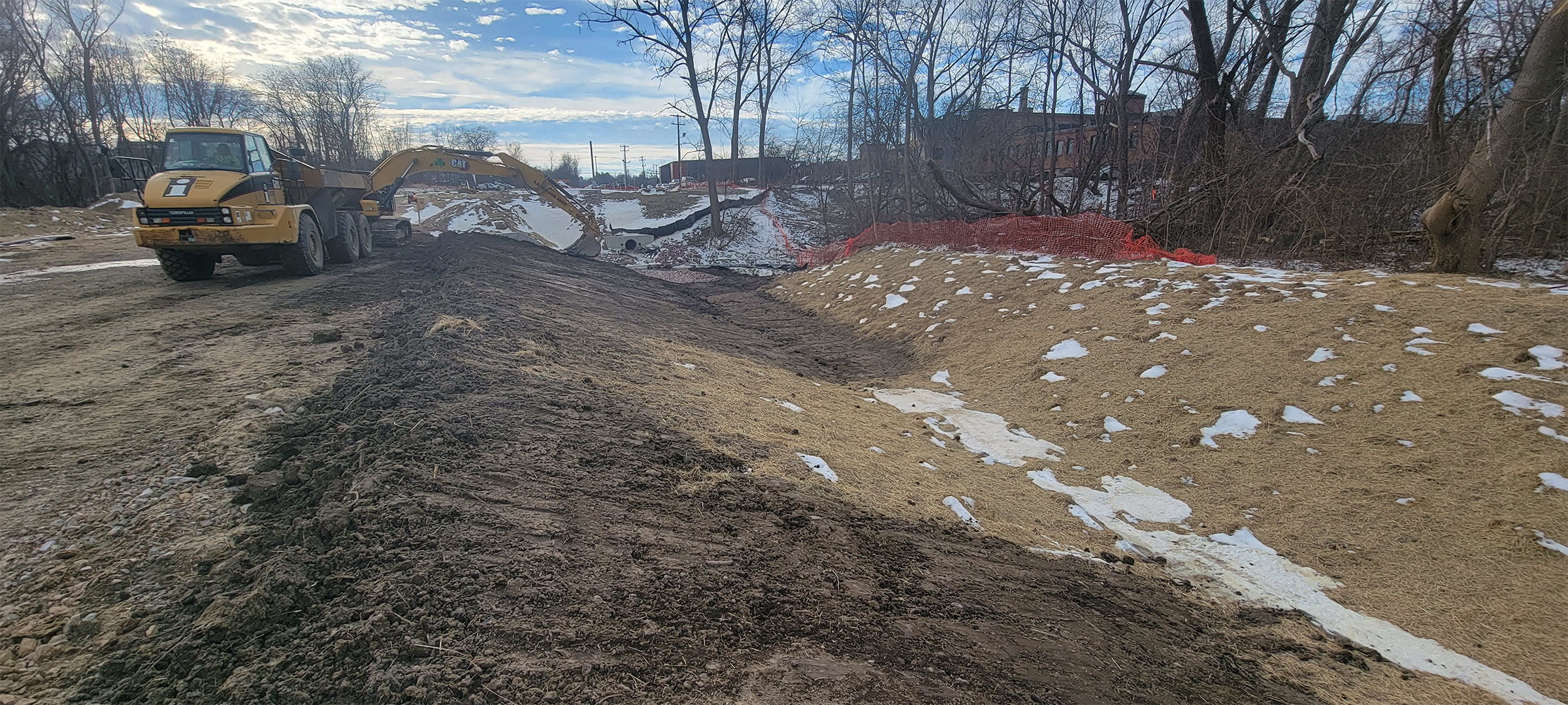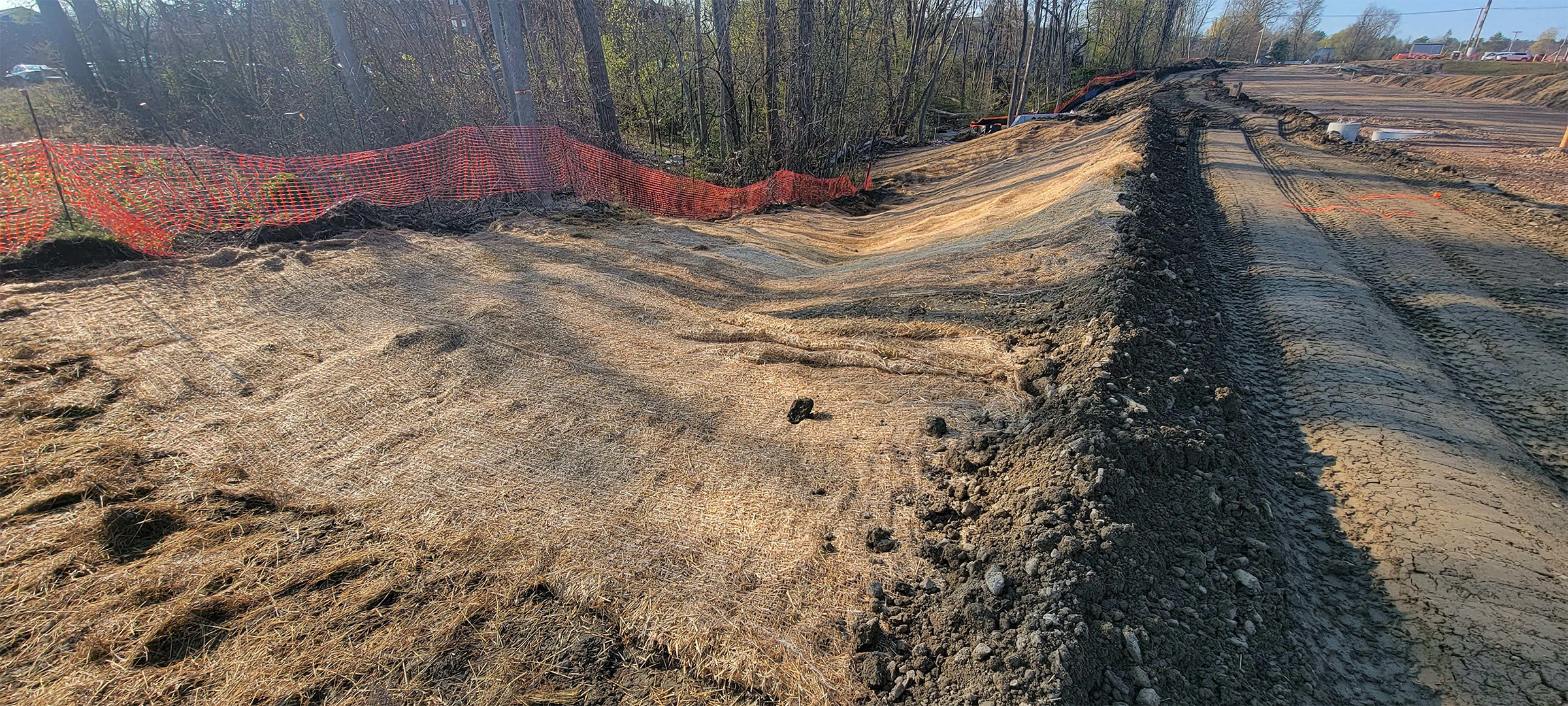 The Champlain Parkway included several stormwater features including the construction of a stormwater detention pond near Englesby Brook. Pictured cable matting.