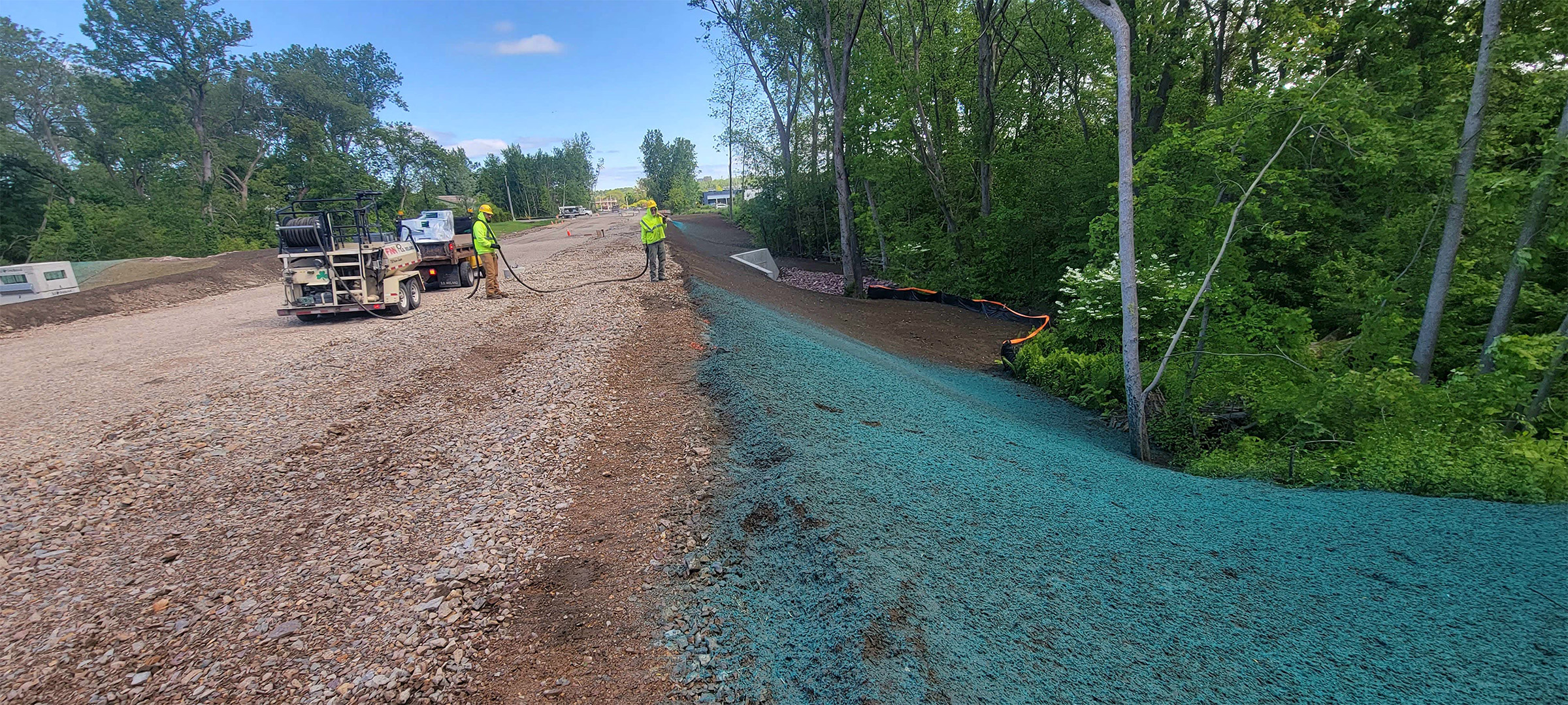Crews placing hydroseed over the newly installed topsoil around the Englesby Brook box culvert.