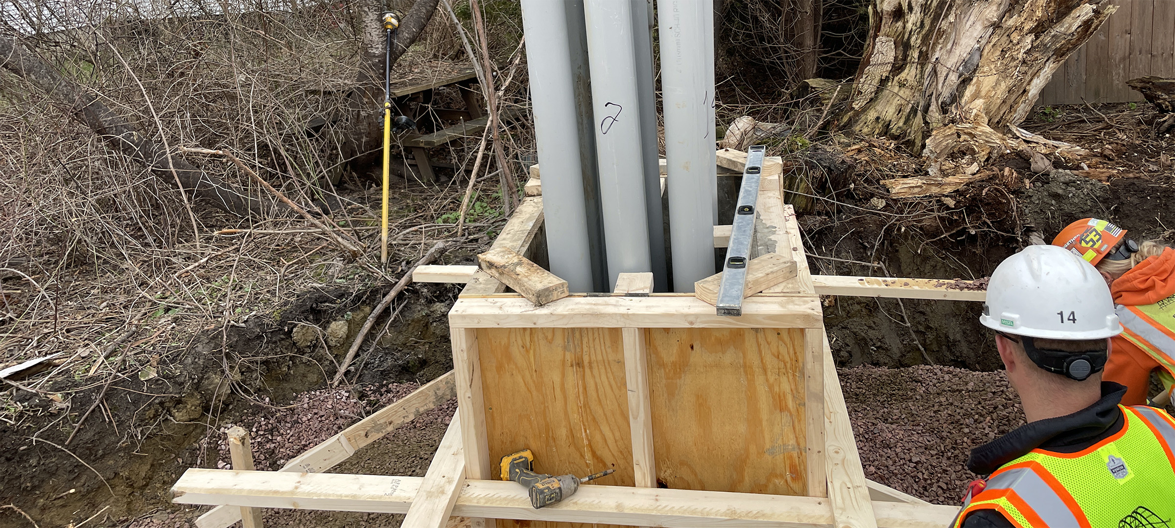 The Champlain Parkway included several stormwater features including the construction of a stormwater detention pond near Englesby Brook. Pictured concrete forms.