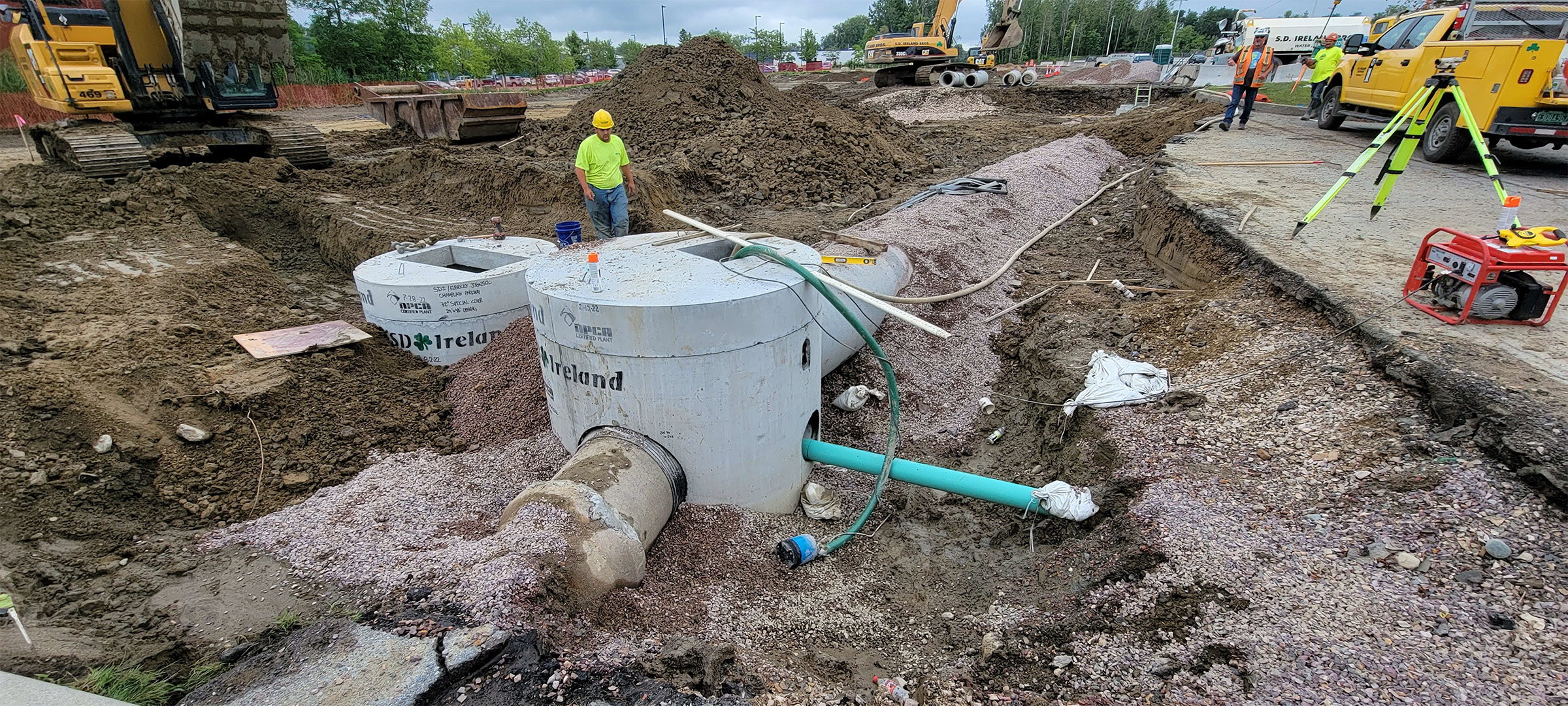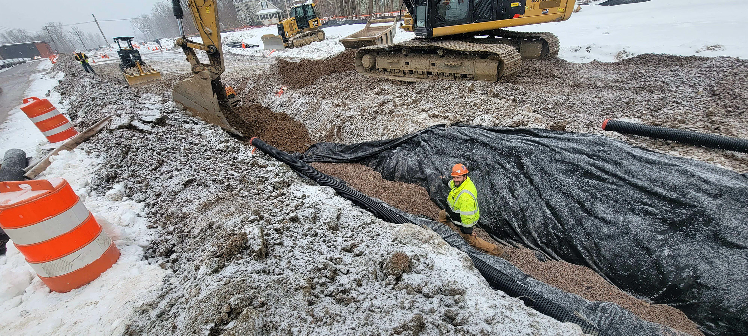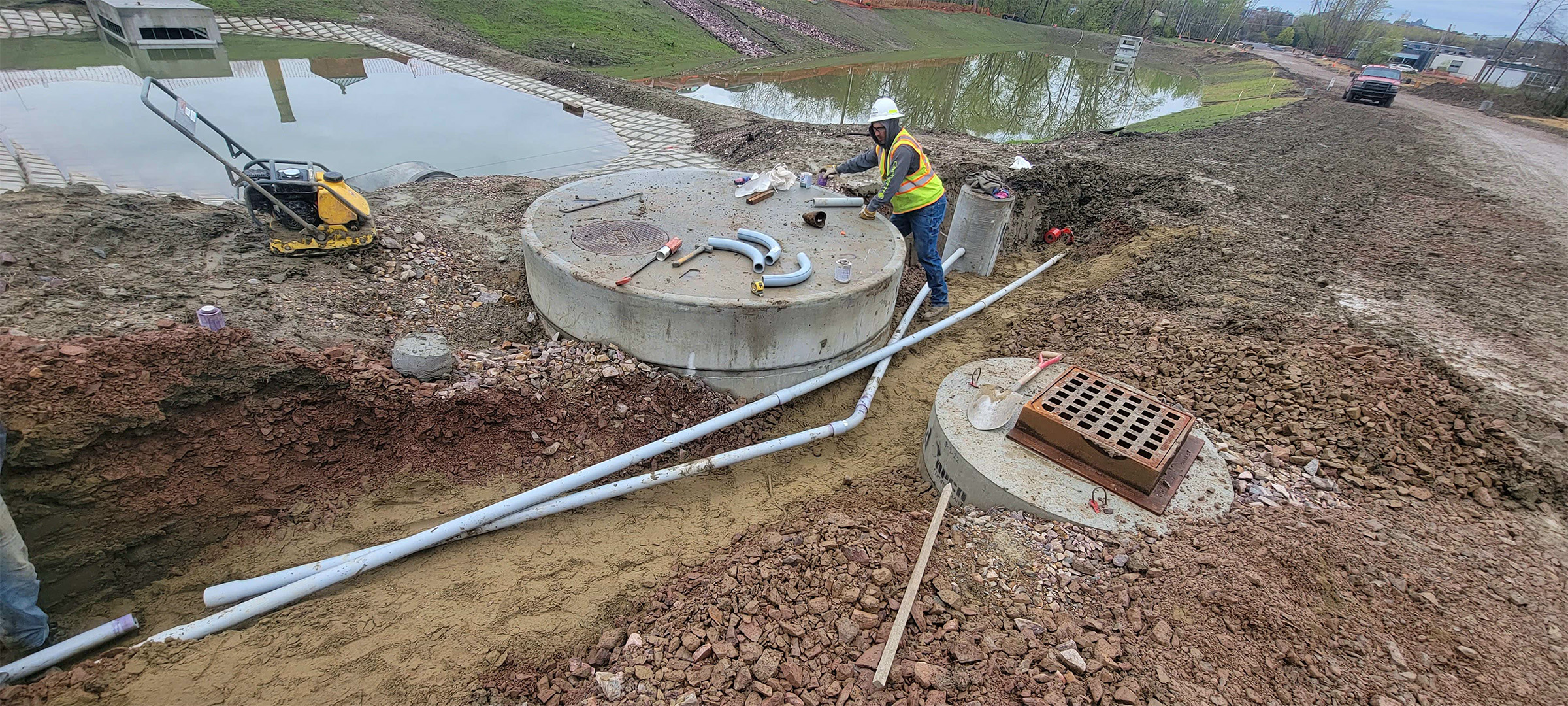 The Champlain Parkway included several stormwater features including the construction of a stormwater detention pond near Englesby Brook. Pictured installation of drainage pipe.