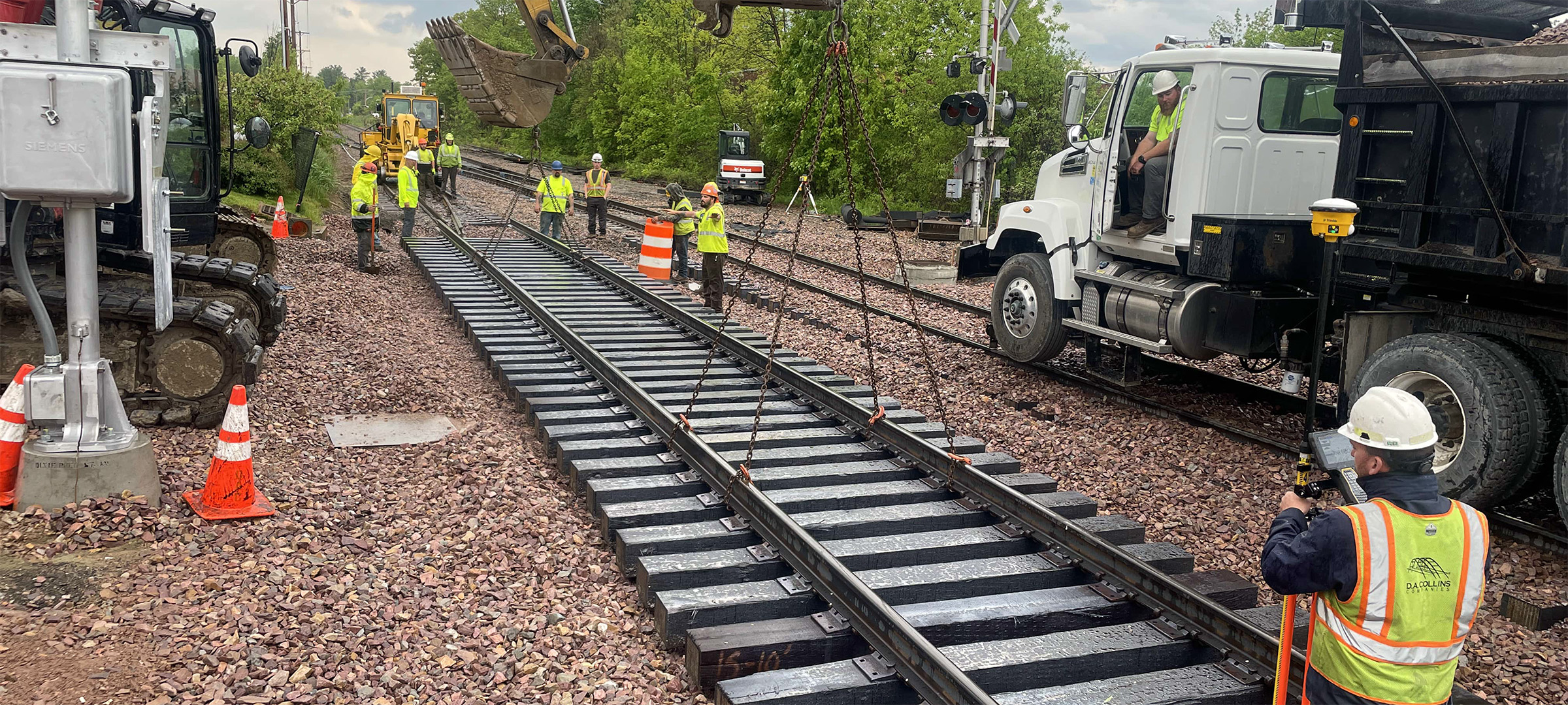 Installation of pre-assembled continuous welded rail and ties for the Flynn Avenue siding.