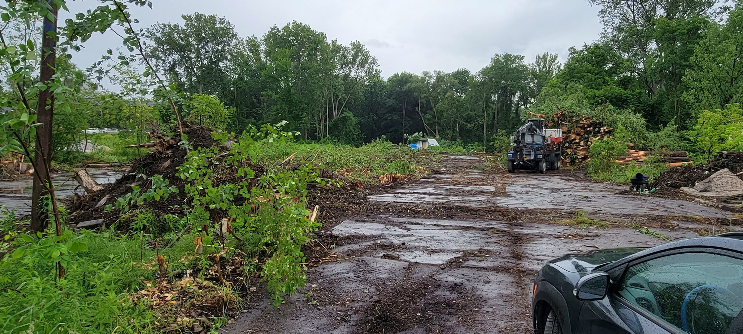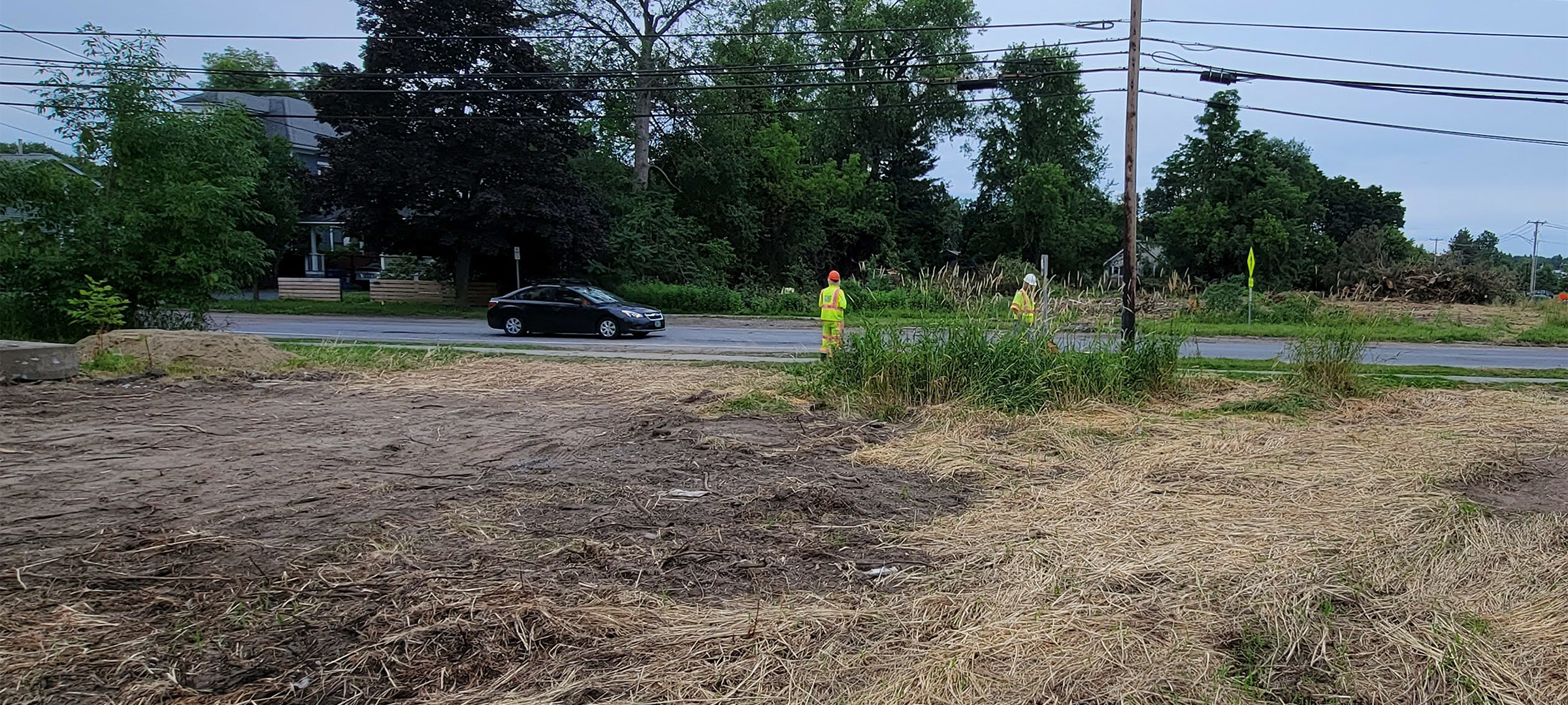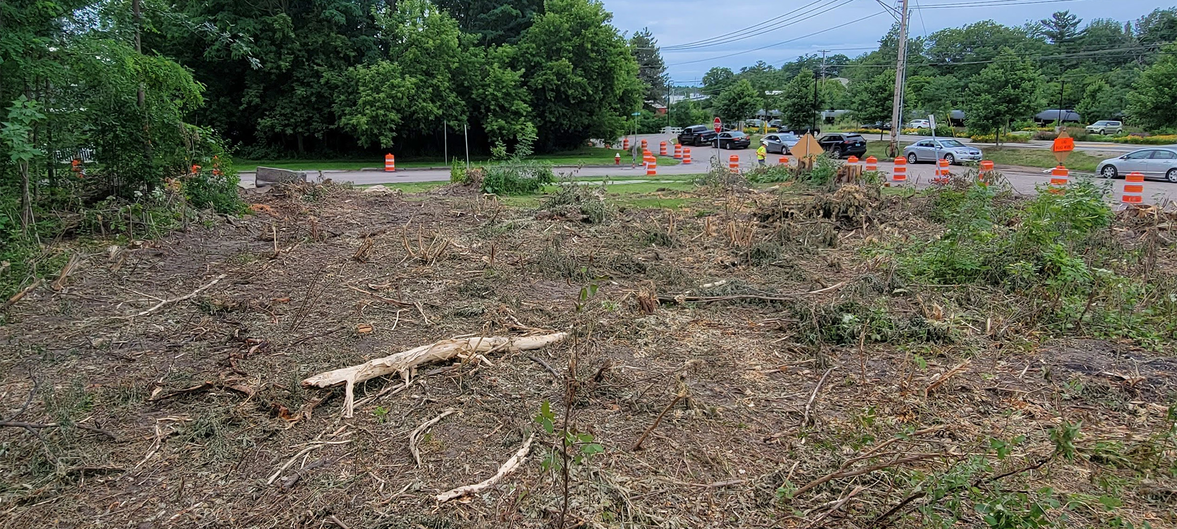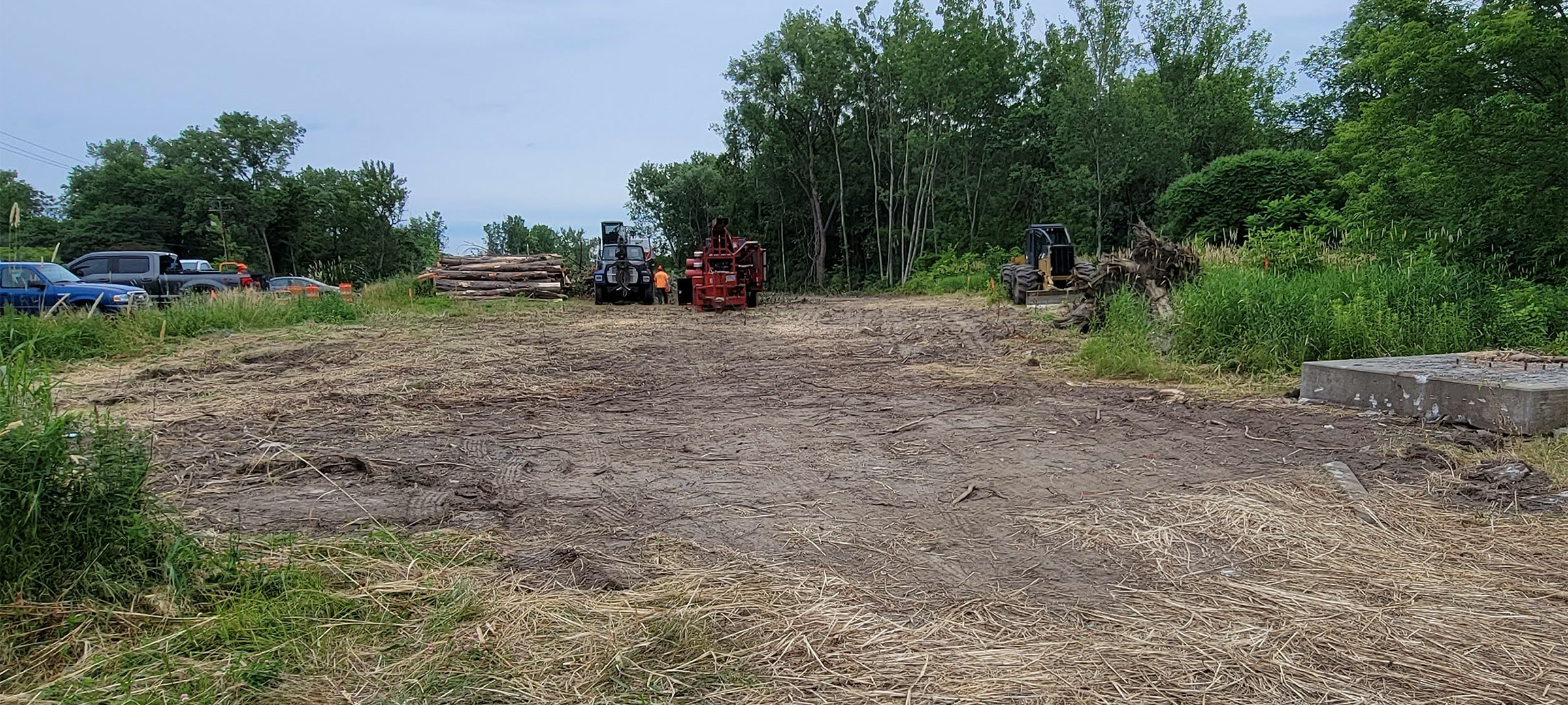 Crews performed clearing and grubbing work along the future Champlain Parkway alignment in preparation for construction. Clearing is the removal of vegetation above the ground such as trees and bushes and grubbing is the removal of subsurface vegetation such as stumps.