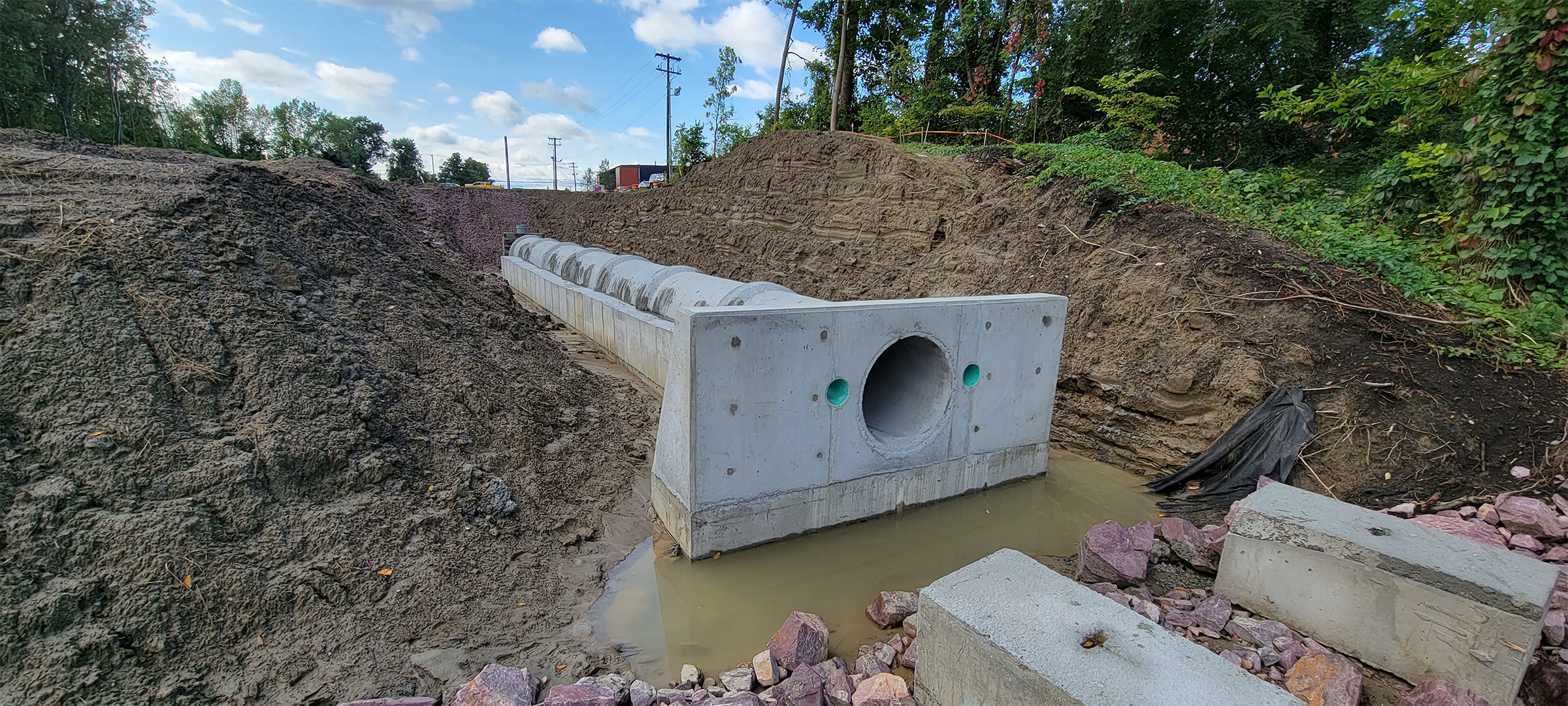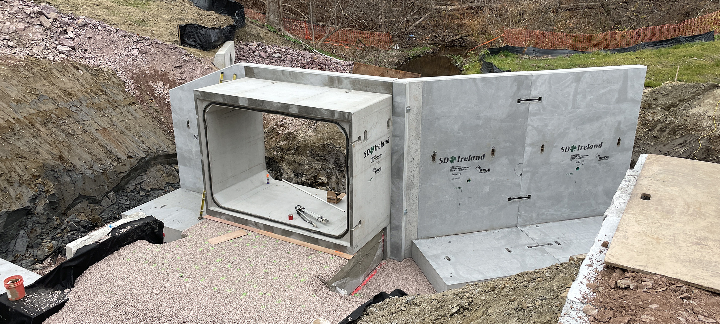 The Champlain Parkway Project includes several stormwater features including a box culvert for the Englesby Brook. Pictured completed upstream end of the box culvert with streambed material placed and water introduced.