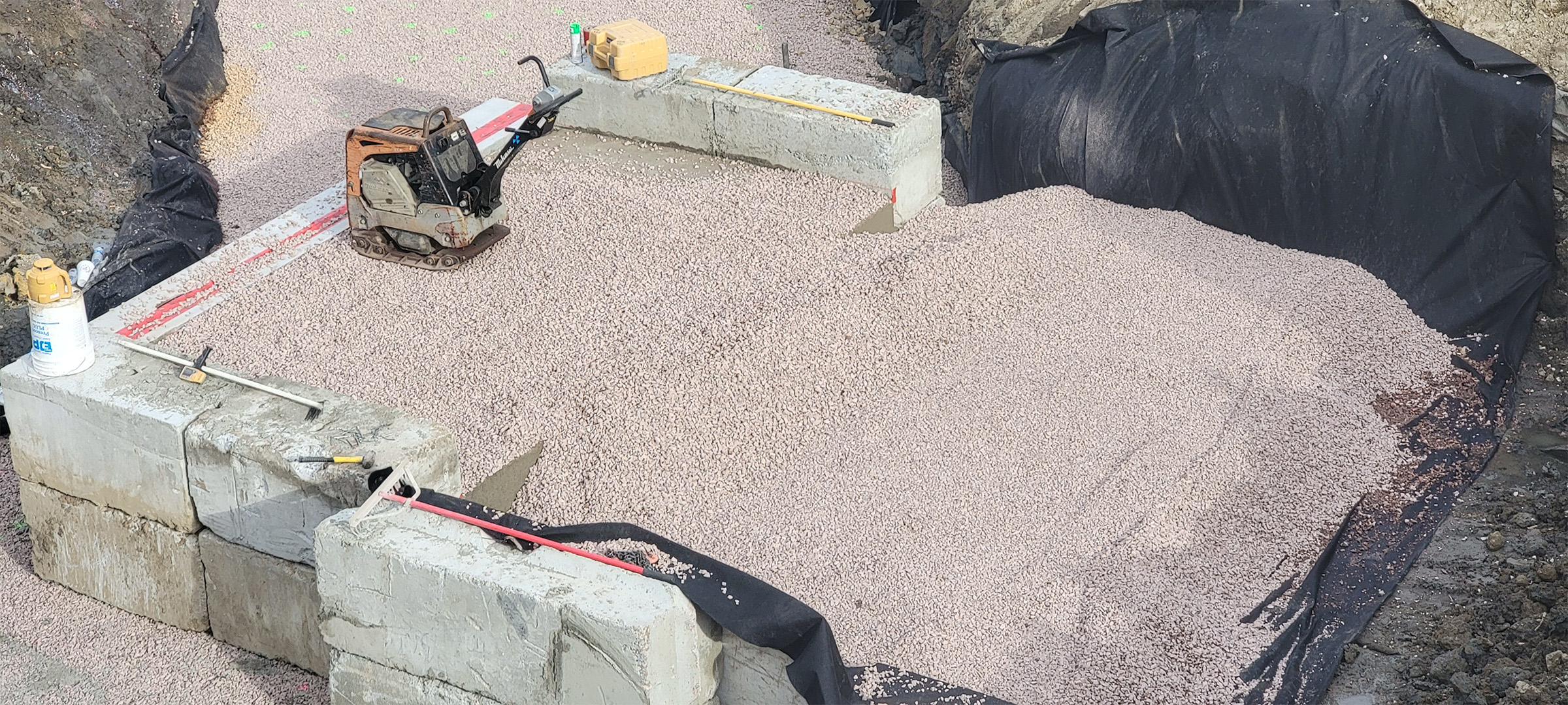 Installation of crushed stone subbase in preparation for the concrete slab support for the brick pavers at the Flynn Avenue pocket park.