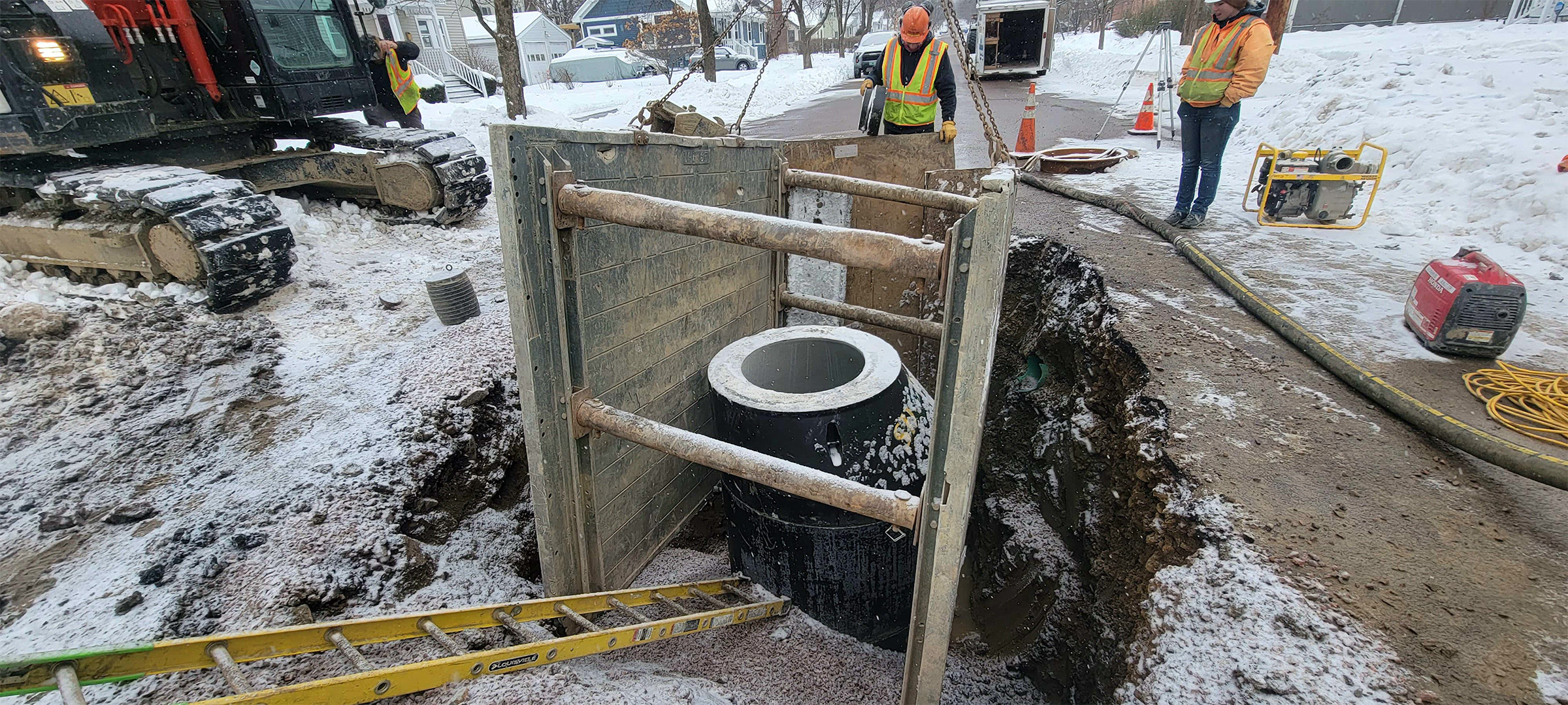 Crews install new sewer line and services throughout the south end to replace existing aging infrastructure. New sewer service installation on Batchelder Street.