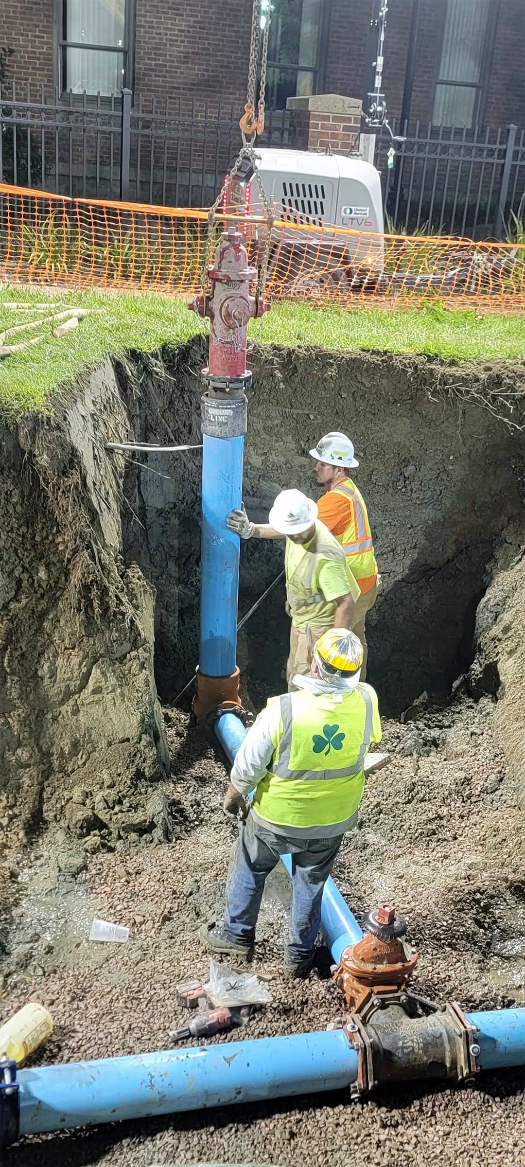 The installation of the four-way water valve assembly at the intersection of Pine Street at Lakeside Avenue at night to reduce impacts to the public.