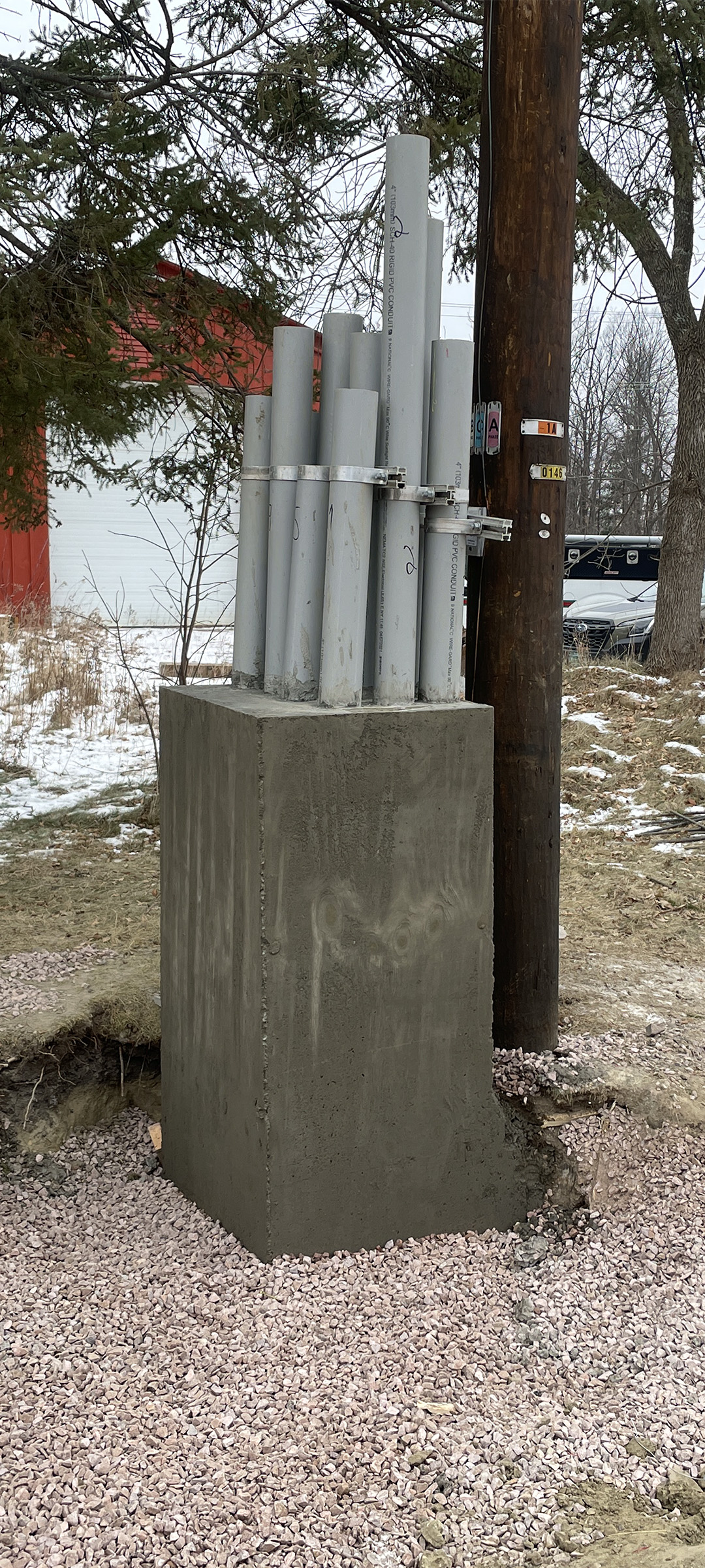 Aerial electrical and telecommunication utilities were relocated underground throughout portions of the south end. Crews installing underground electrical and telecommunication duct bank. This shows the concrete riser that houses the underground conduits at its terminus on Briggs Street.