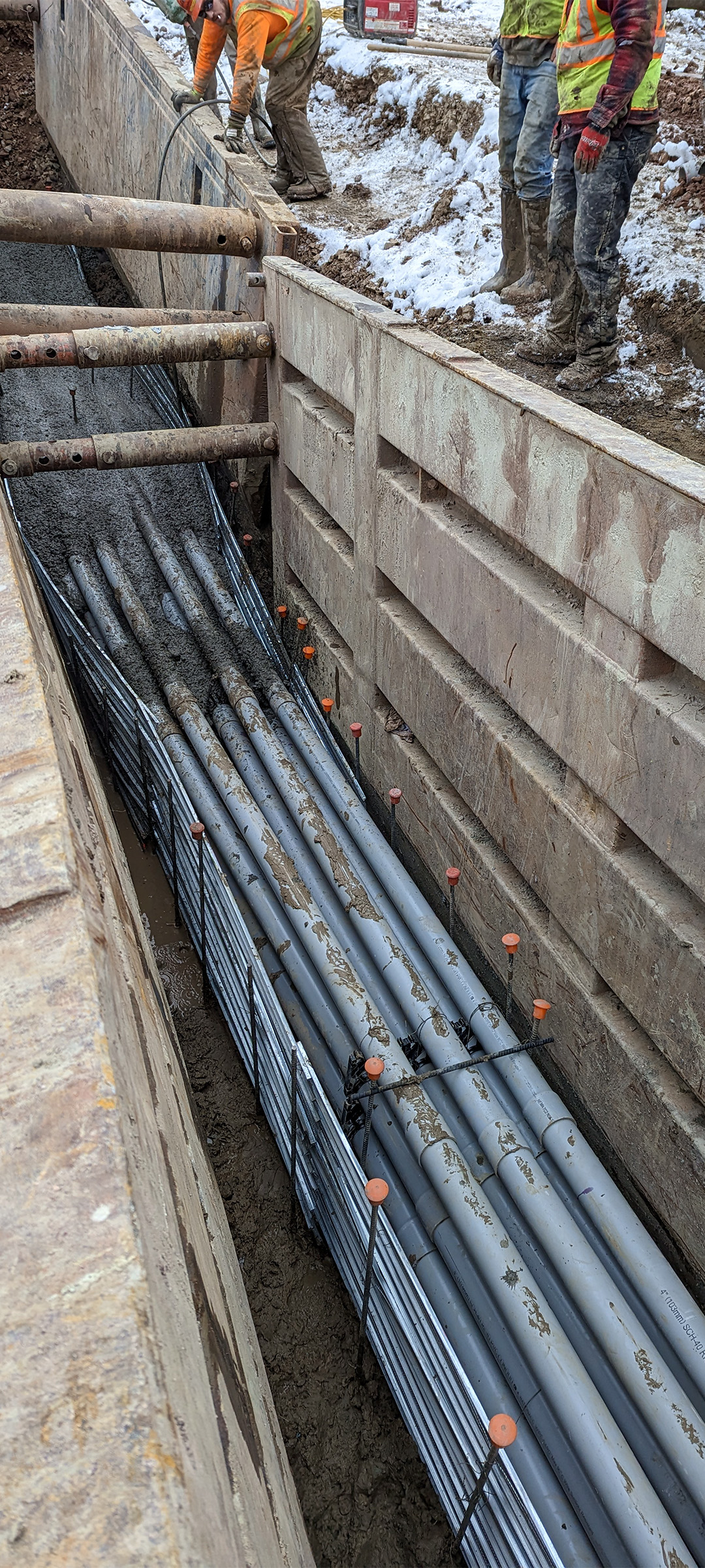 Placement of concrete to encase the electrical and communication duct banks installed along Lakeside Avenue.