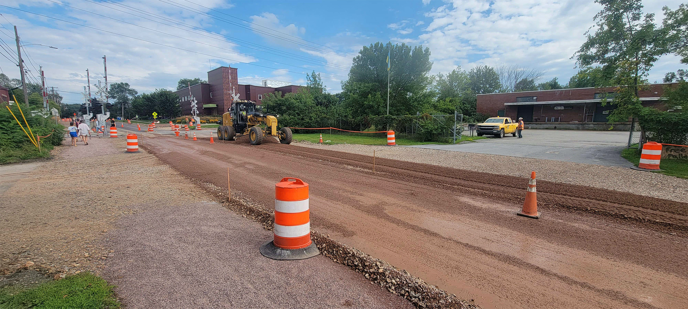 Fine grading the shared use path near the Home Avenue railroad crossing in preparation for base paving.