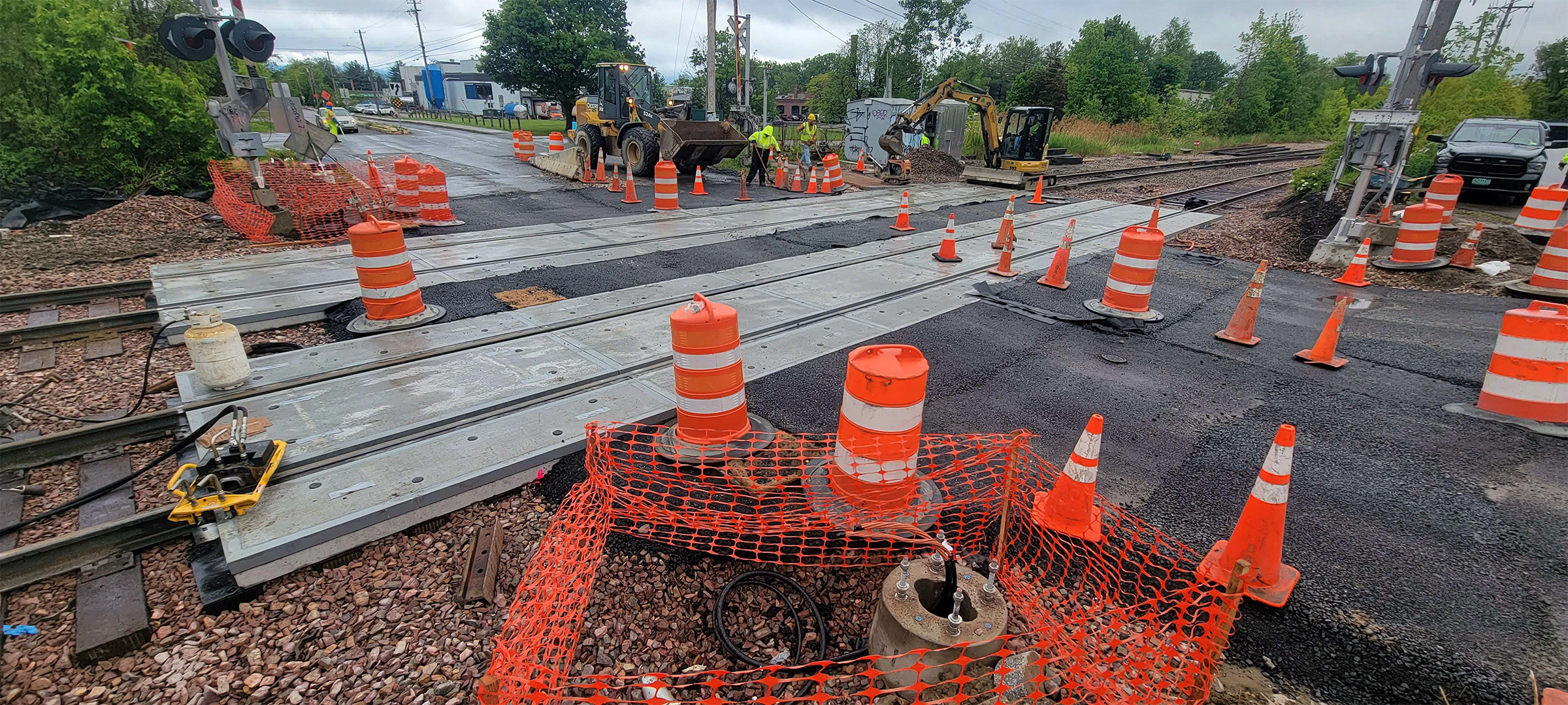 The newly installed asphalt and precast concrete panels at the railroad crossing at Flynn Avenue.